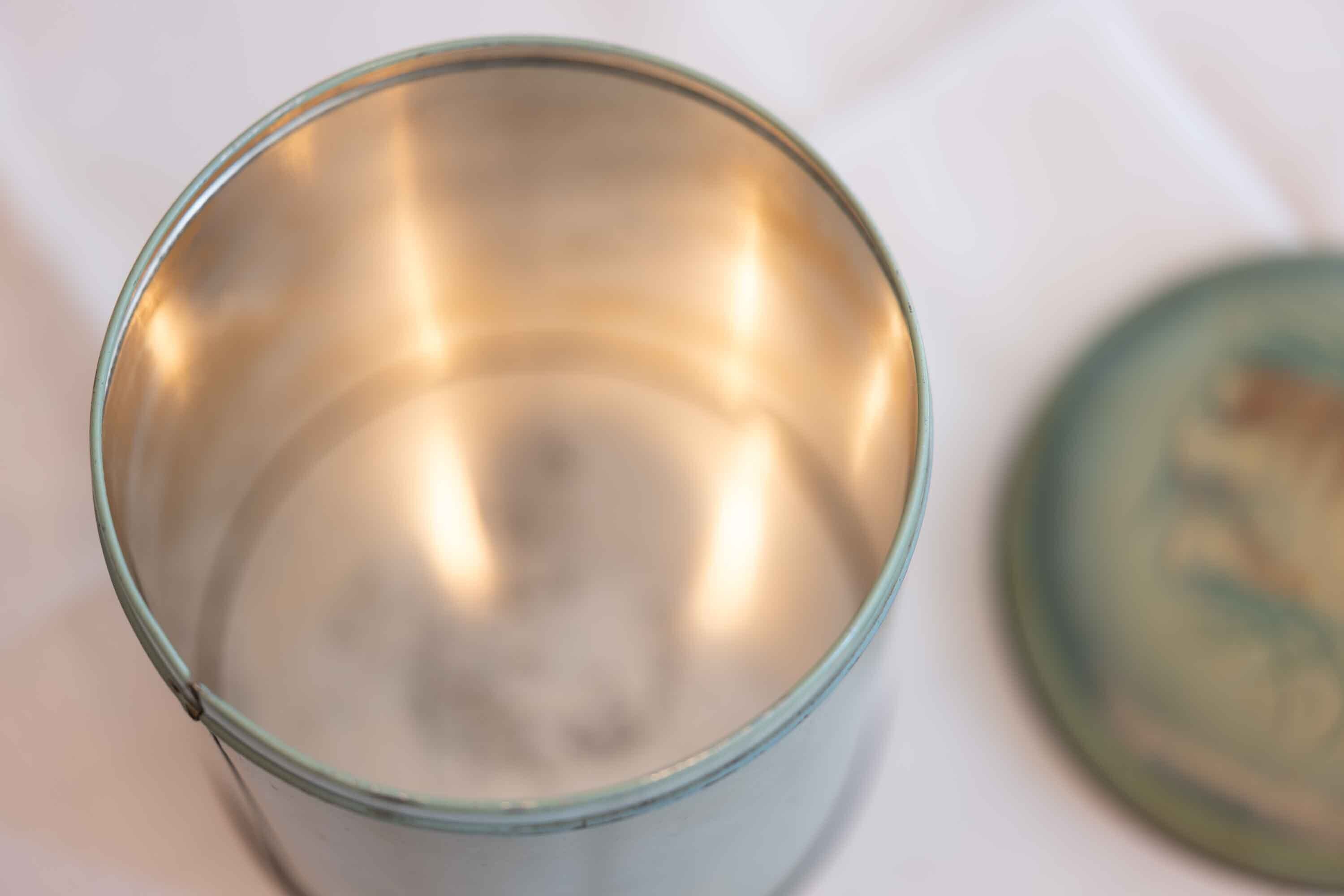 ブルーと一言で表すことができない微妙な色味が美しいアンティーク TIN アルミ缶です。