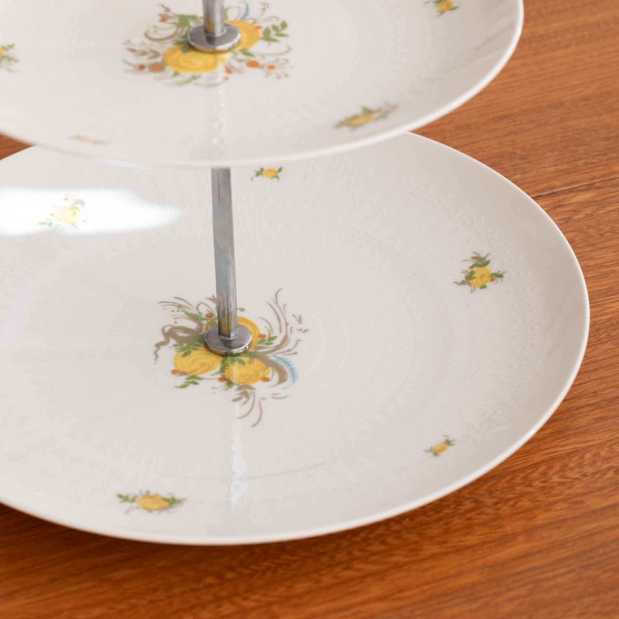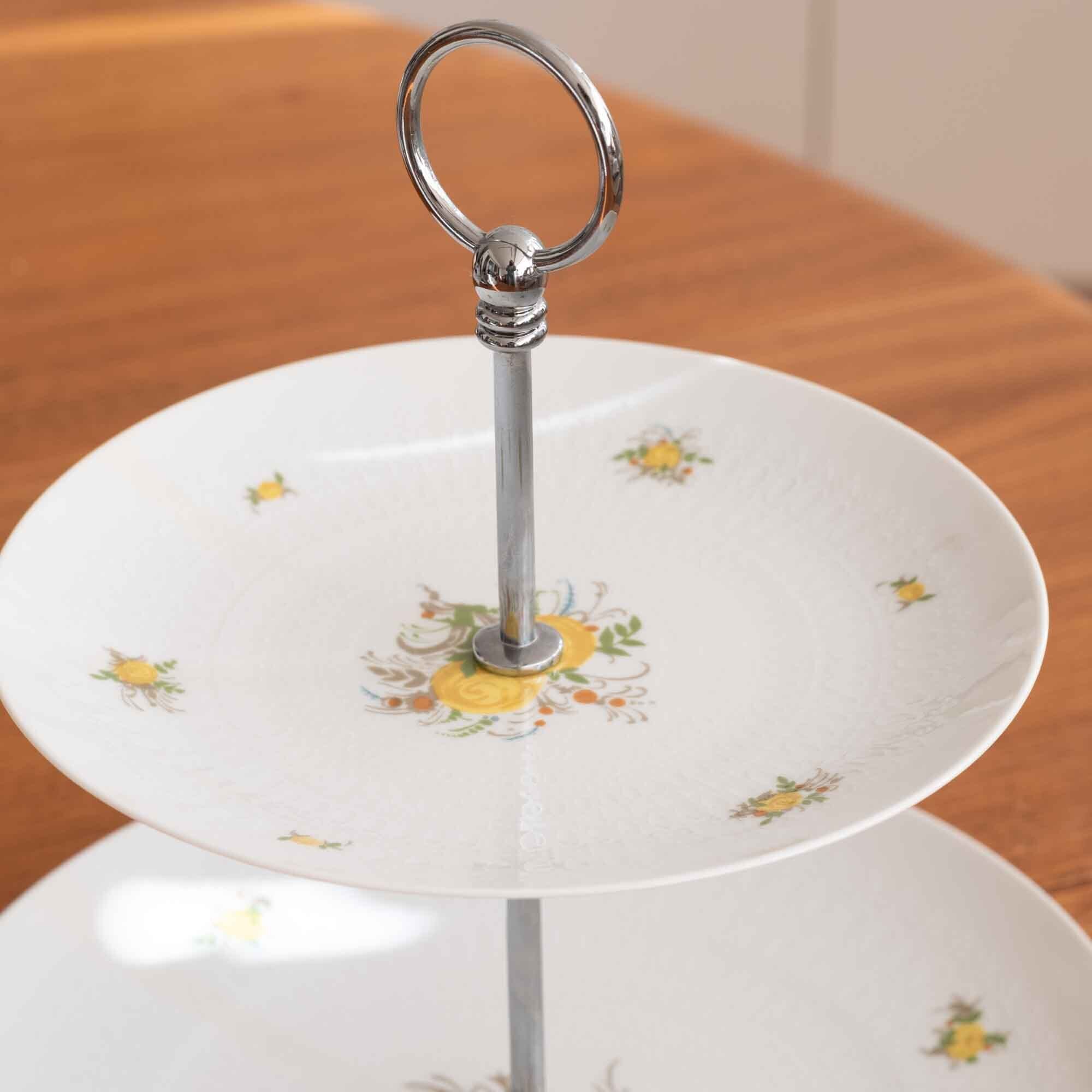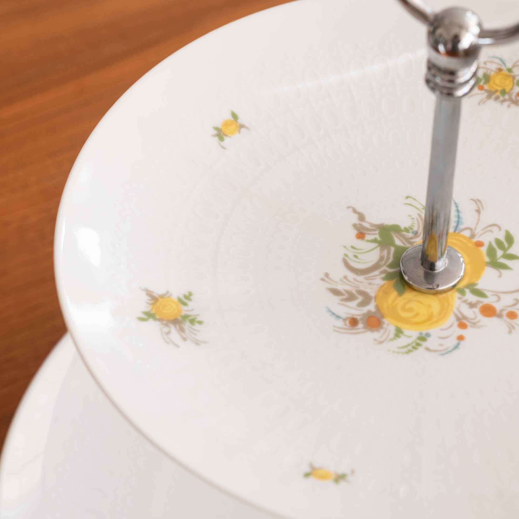 ドイツローゼンタール 社製のロマンスシリーズの「イエローローズ」パターンのお皿が使われたケーキスタンドです。