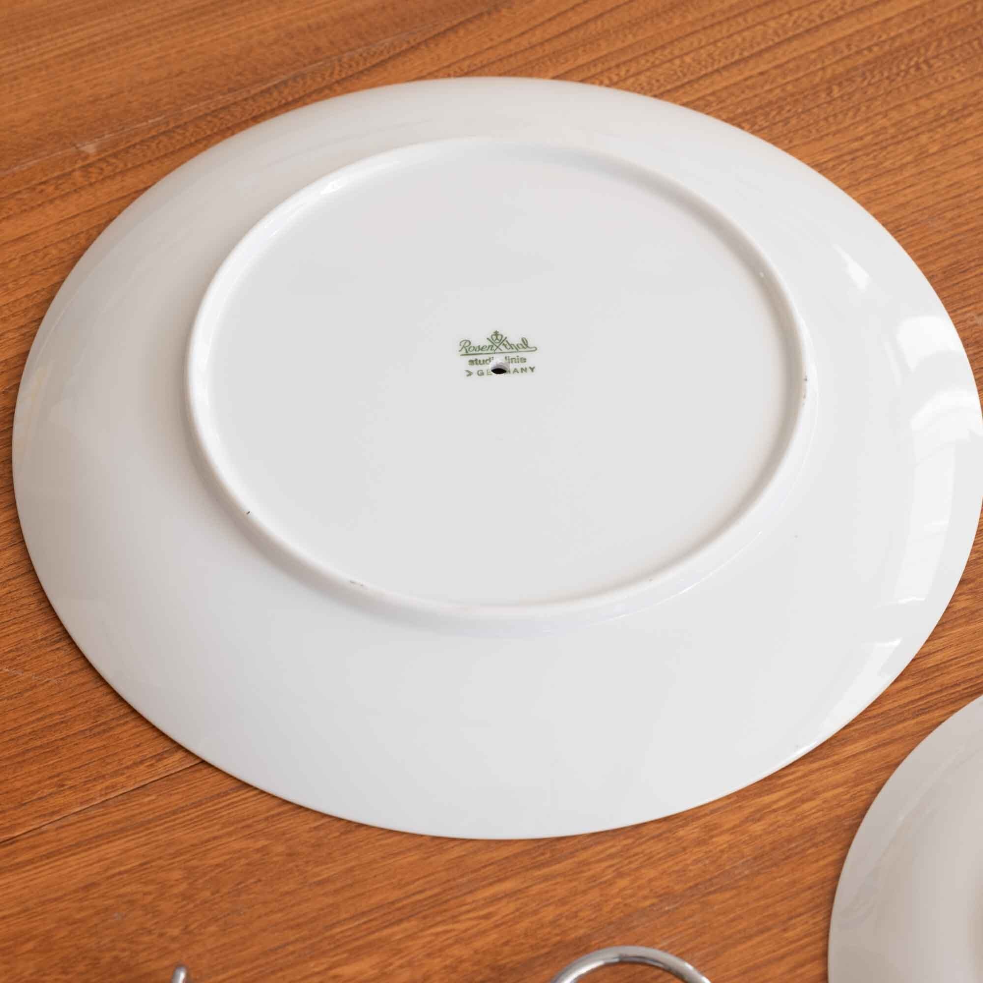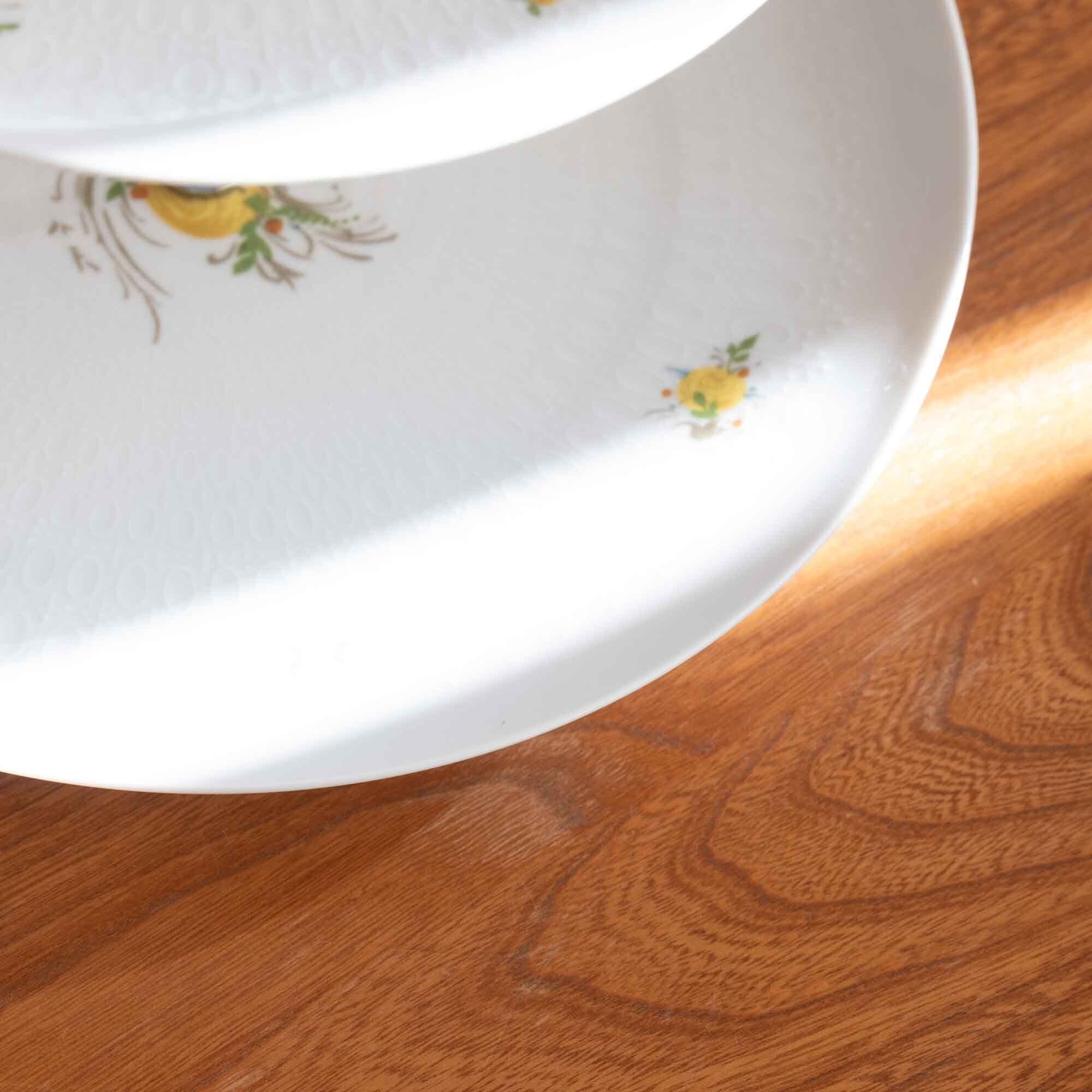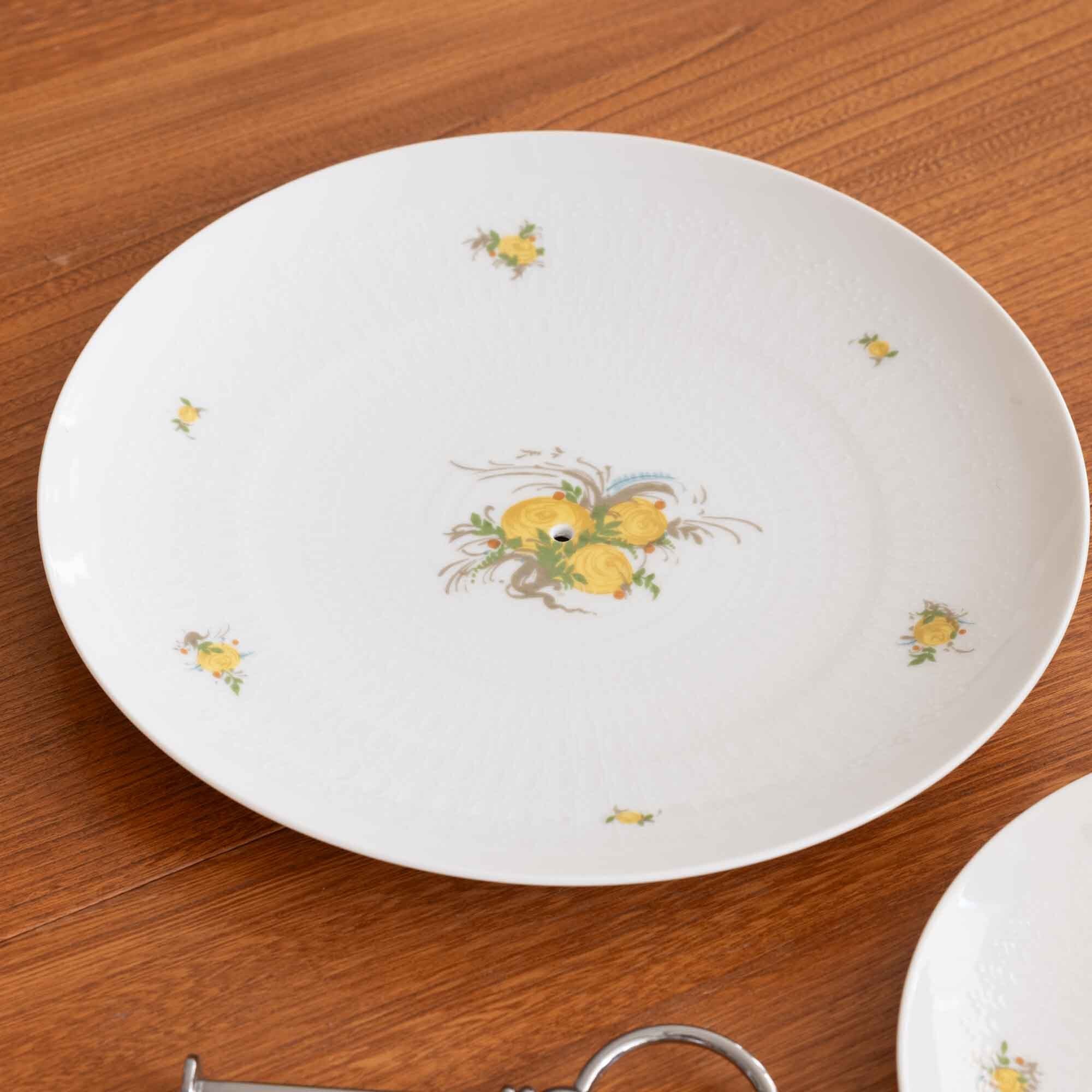 ドイツローゼンタール 社製のロマンスシリーズの「イエローローズ」パターンのお皿が使われたケーキスタンドです。
