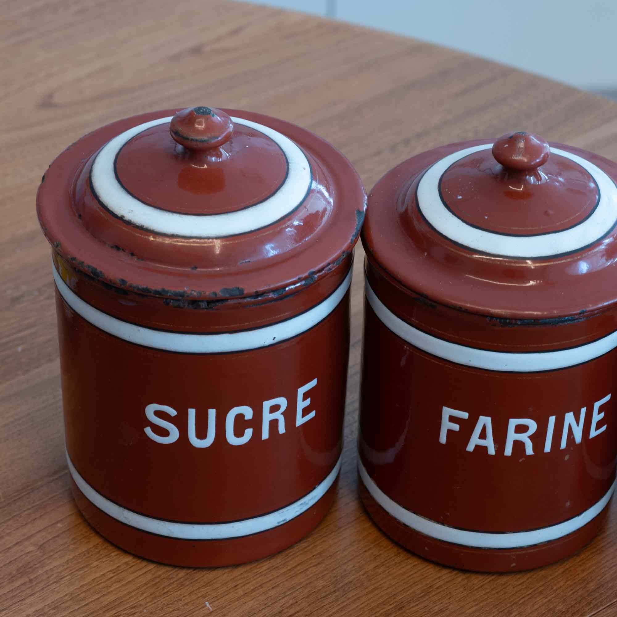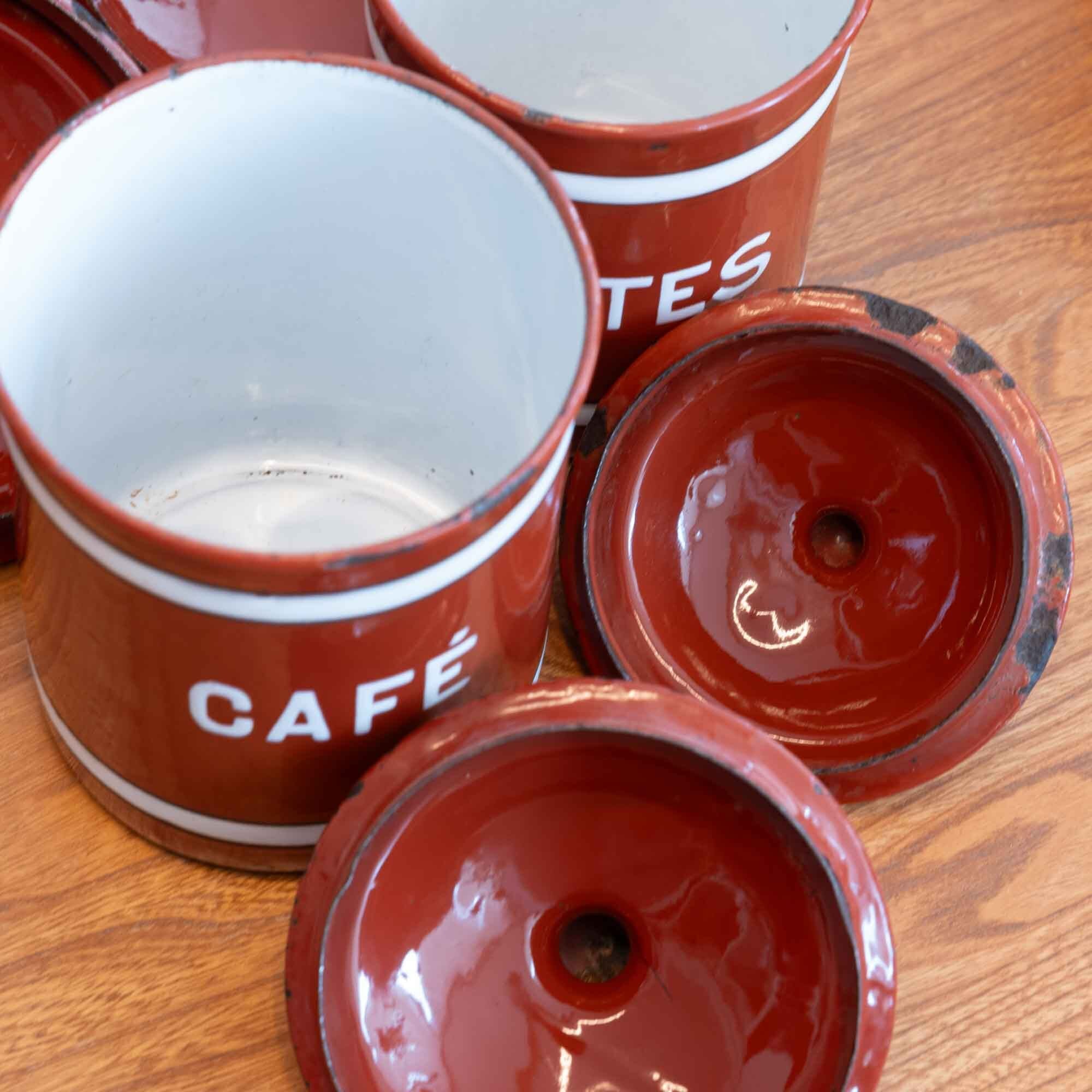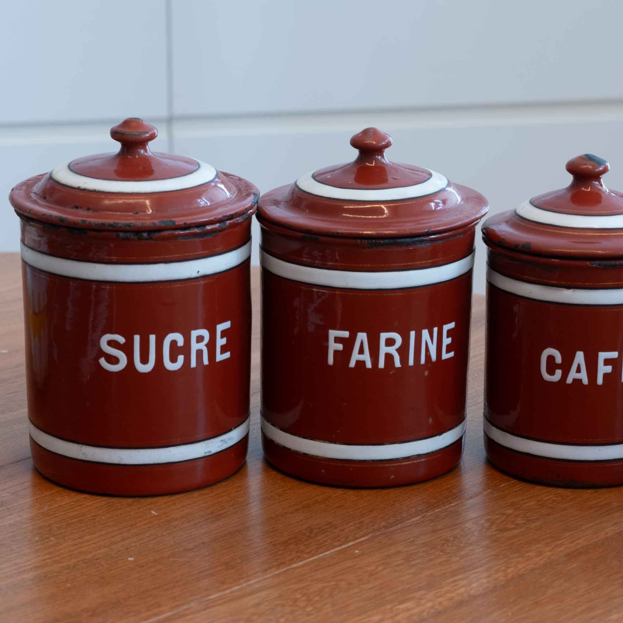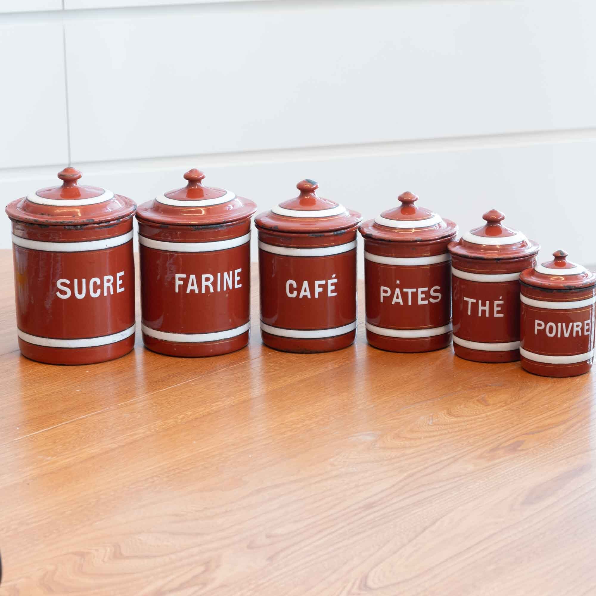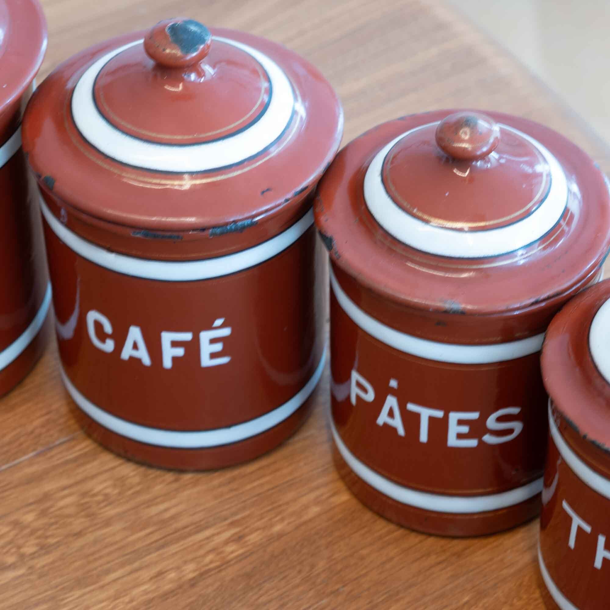 フランス フレンチホーローらしいキャニスターフルセット ブラウンにホワイトのラインが素敵です♪