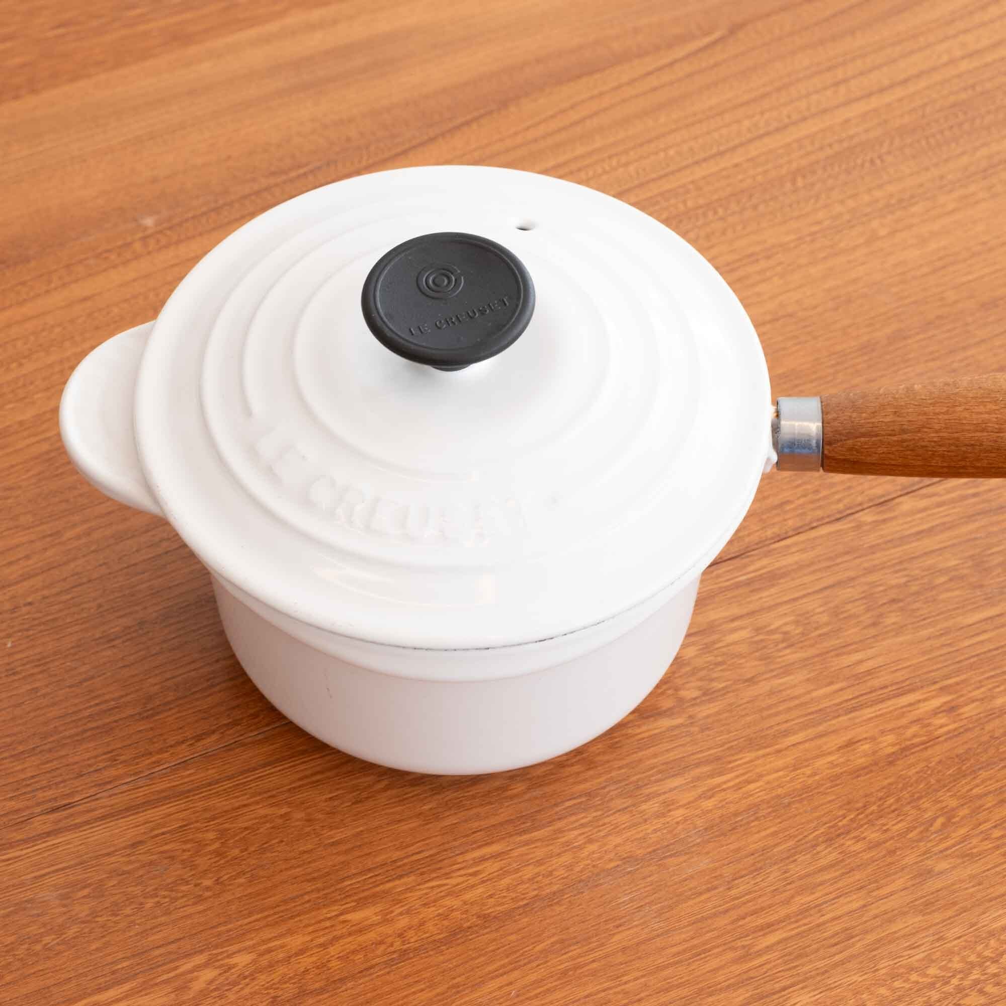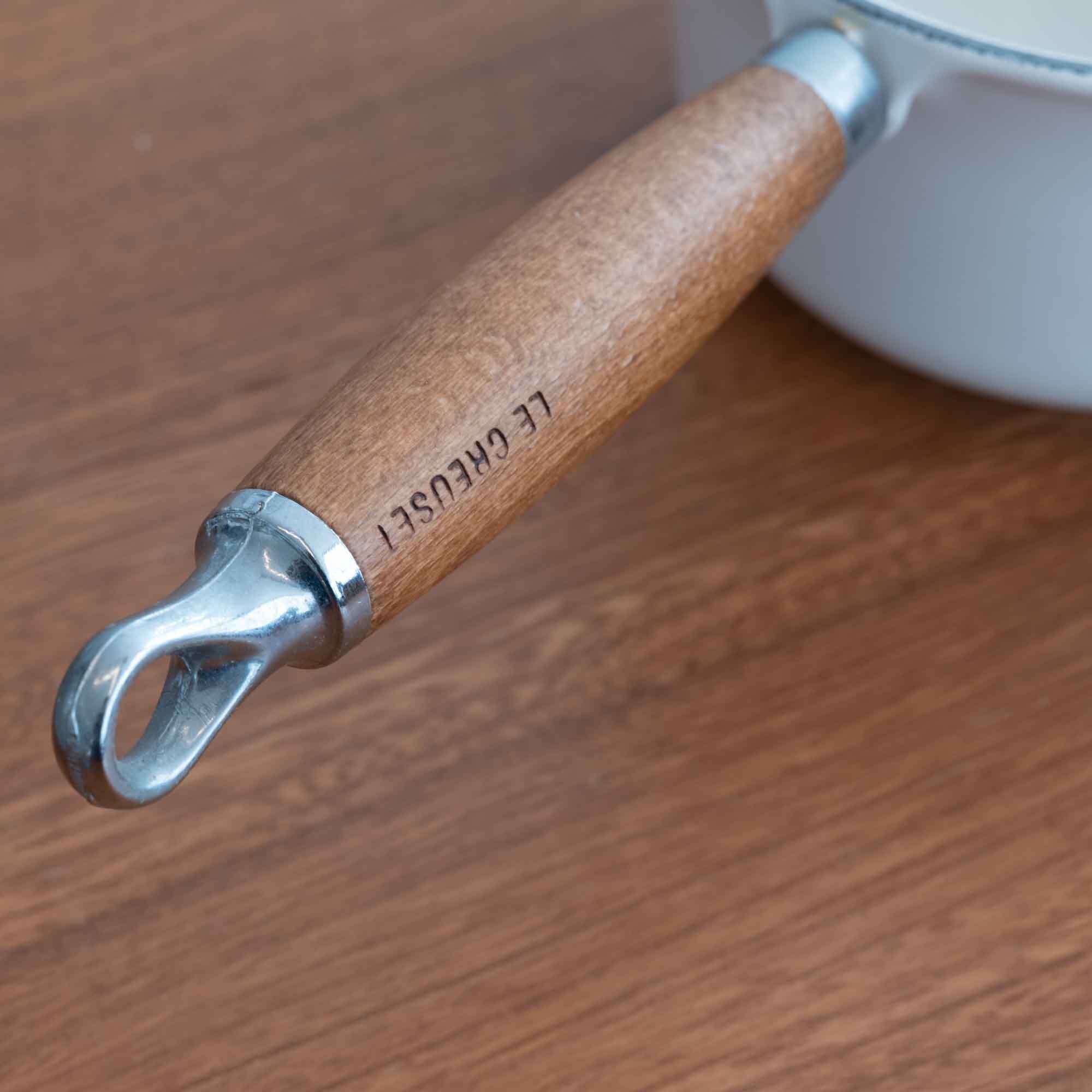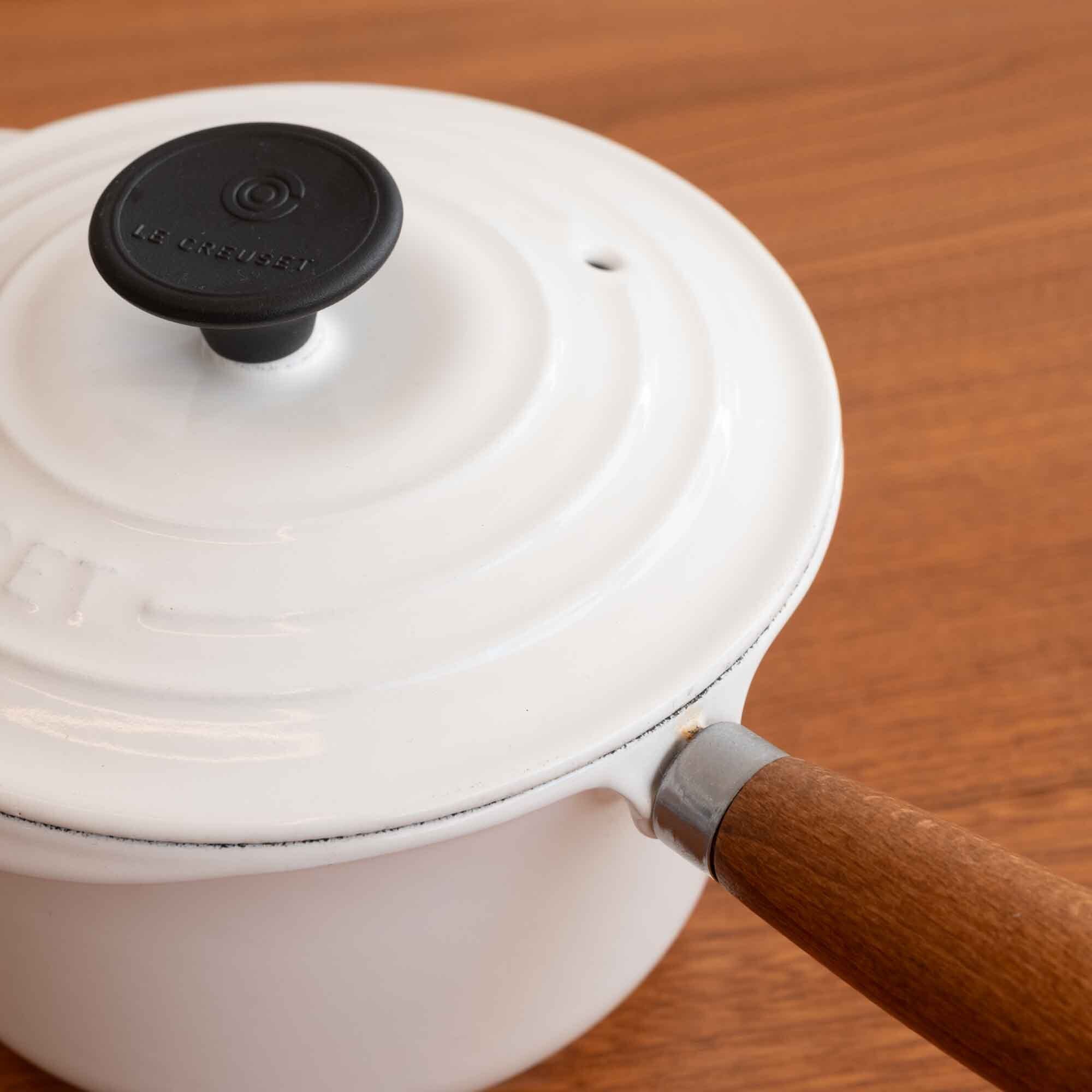 木製ハンドルが素敵なビンテージ ル・クルーゼ LE CREUSET の16サイズの小さなサイズのホワイトのハンドルソースパンです。