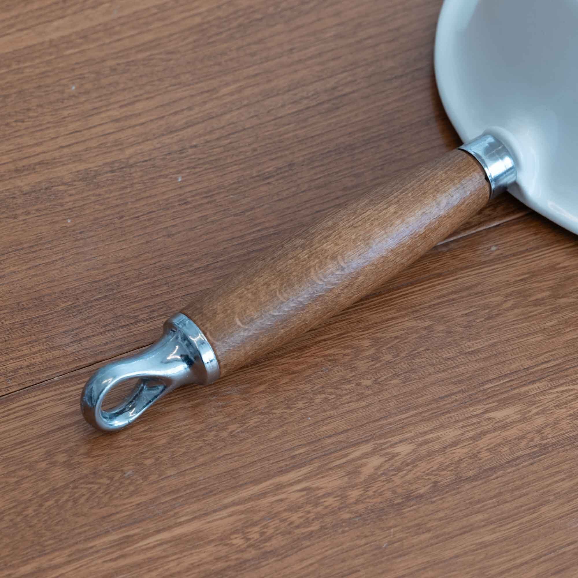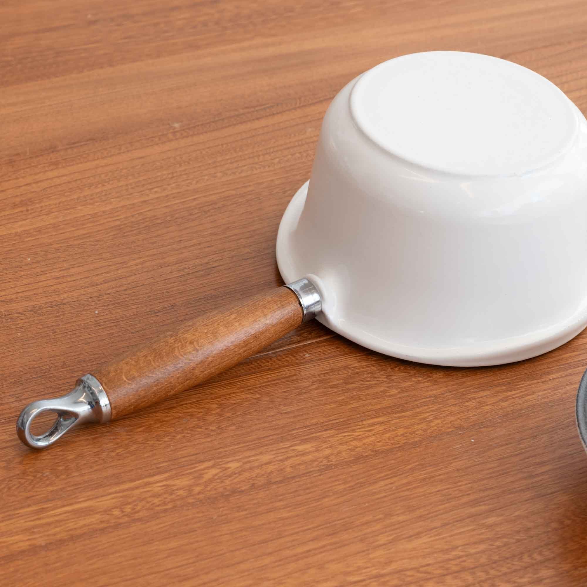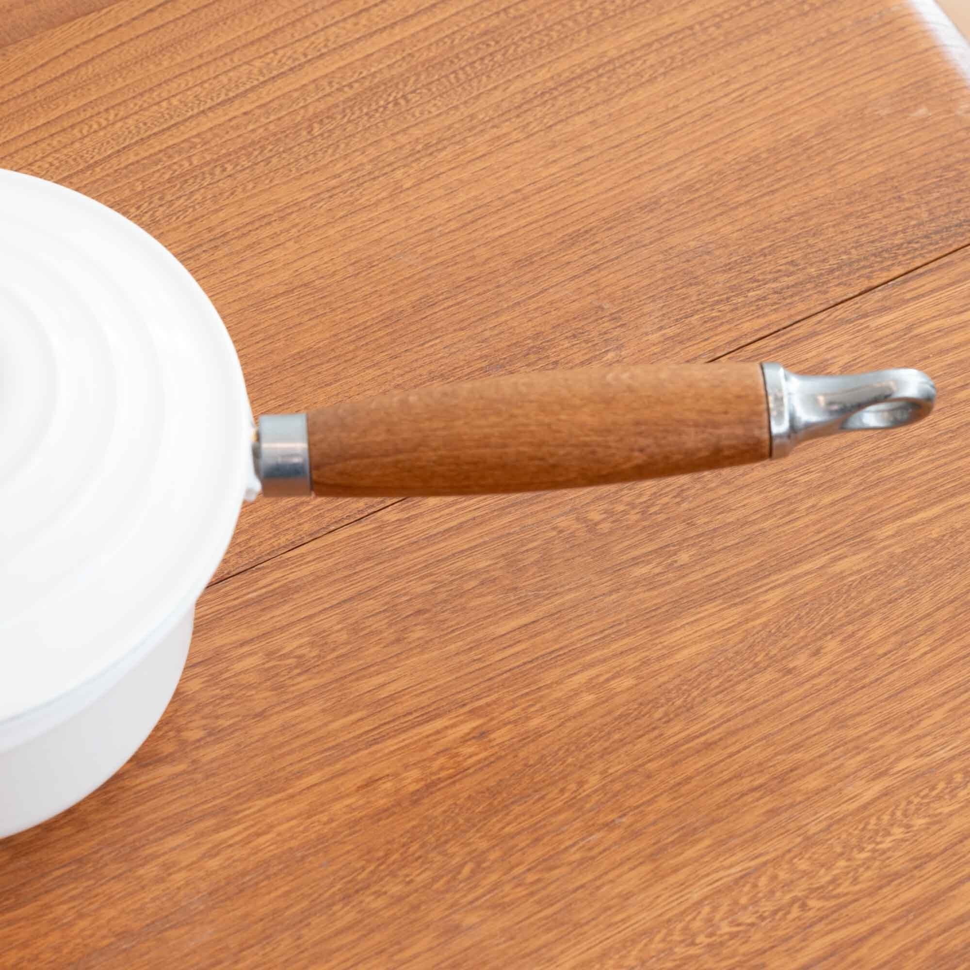 木製ハンドルが素敵なビンテージ ル・クルーゼ LE CREUSET の16サイズの小さなサイズのホワイトのハンドルソースパンです。