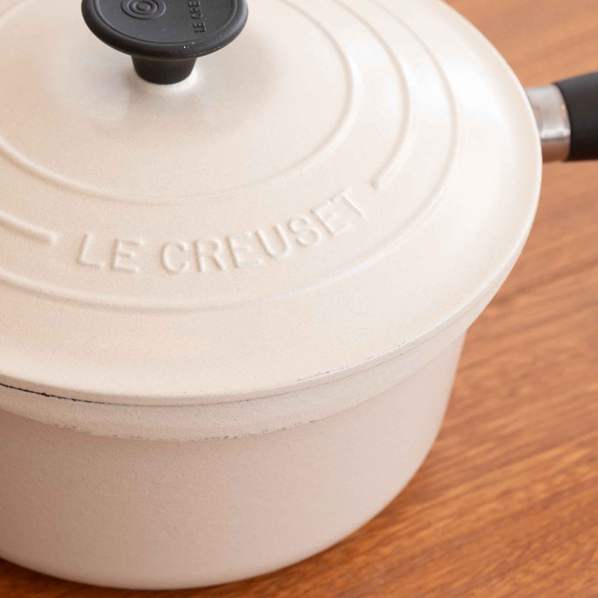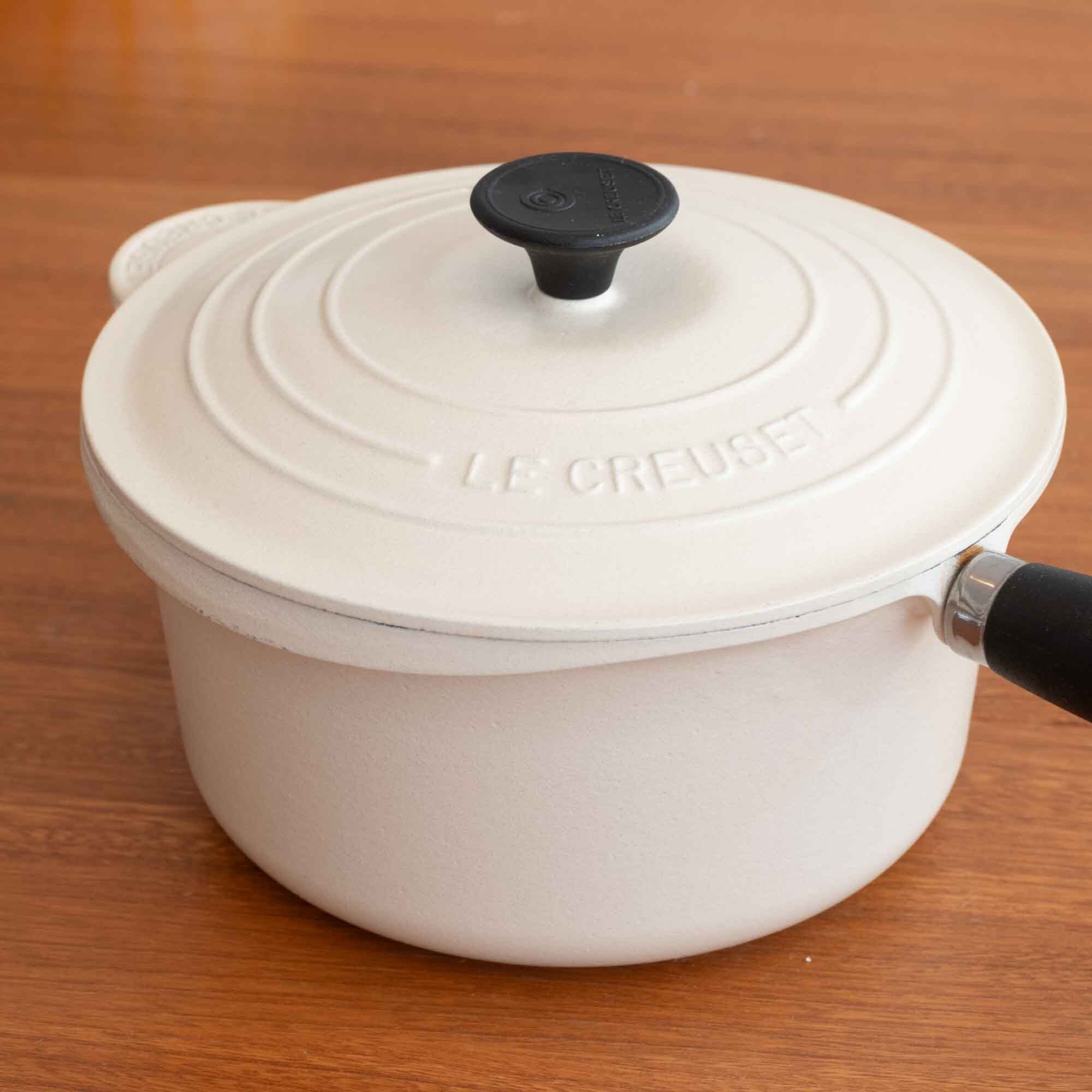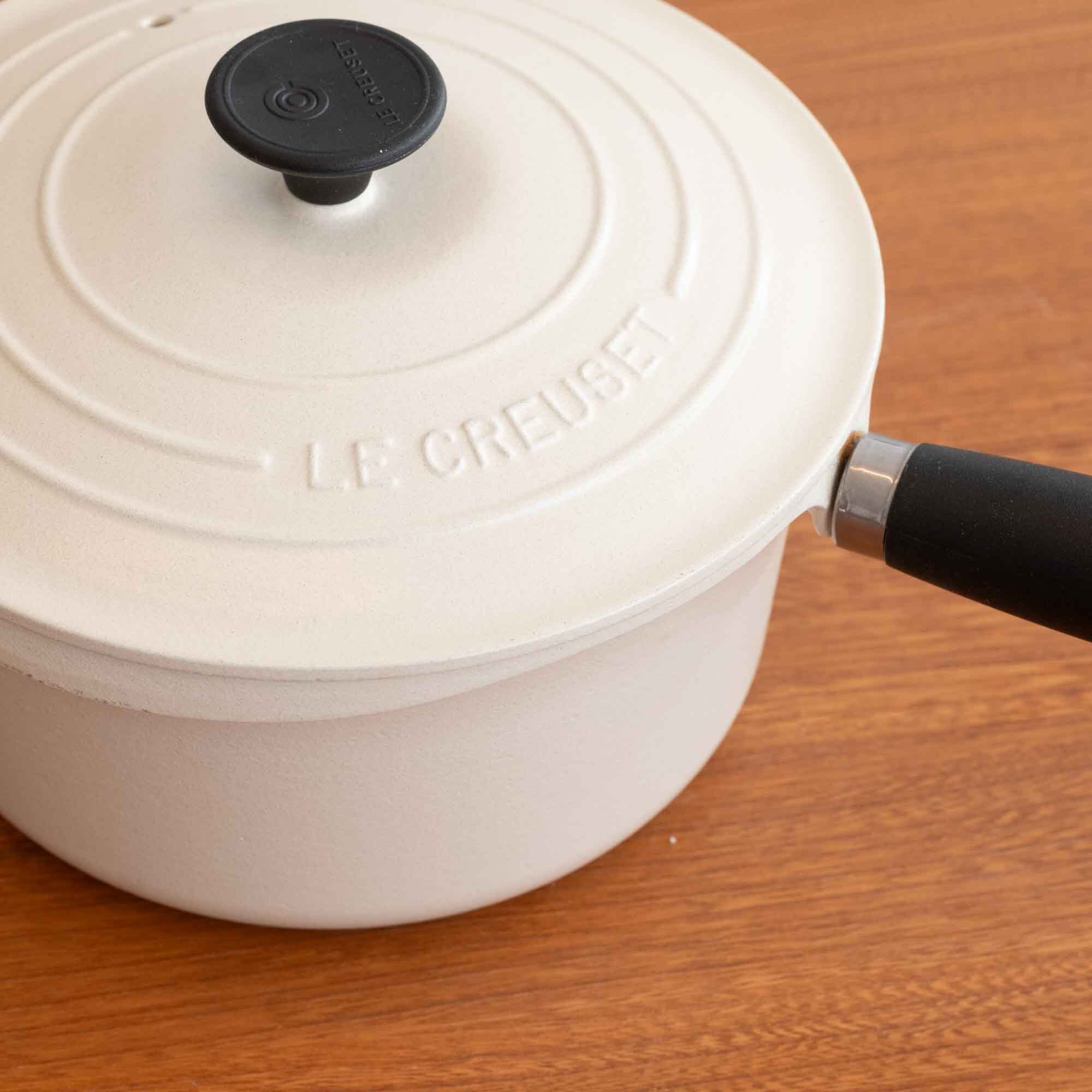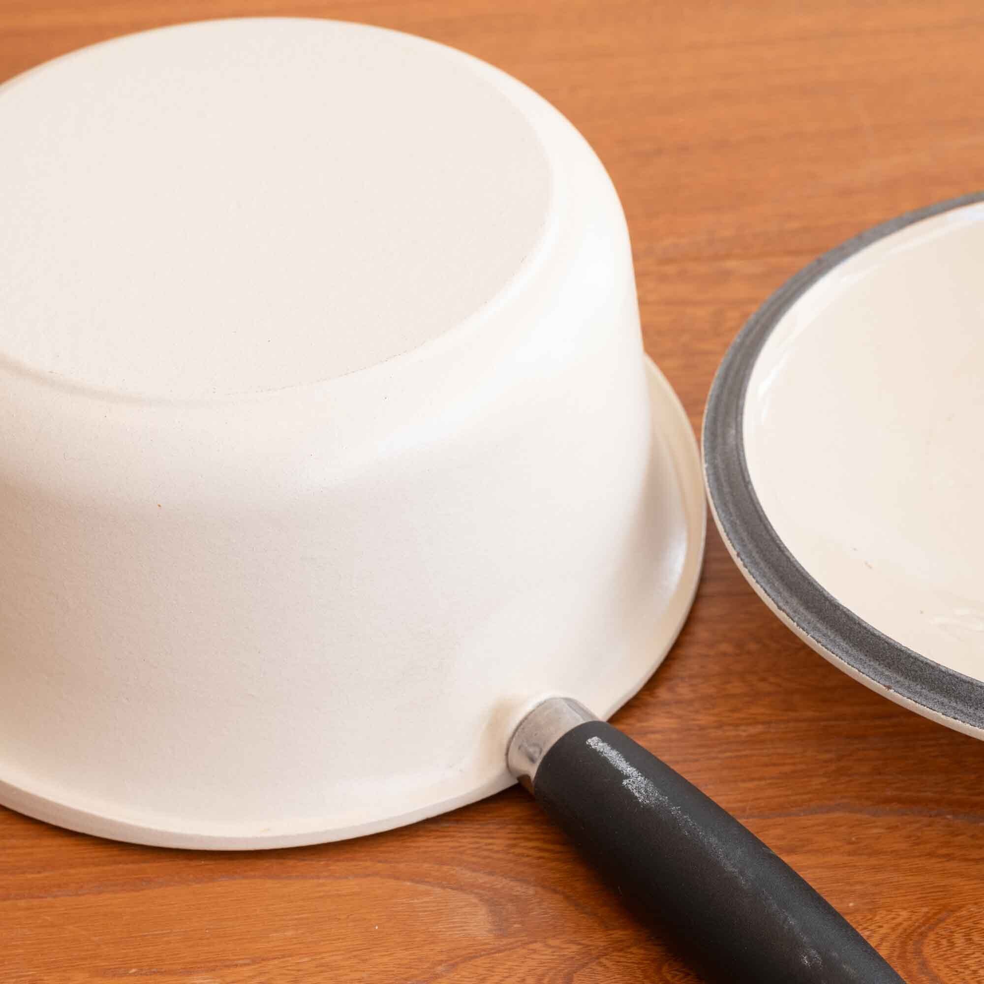ビンテージ ル・クルーゼ LE CREUSET ホワイトのサイズ20のハンドル付きのお鍋です。
