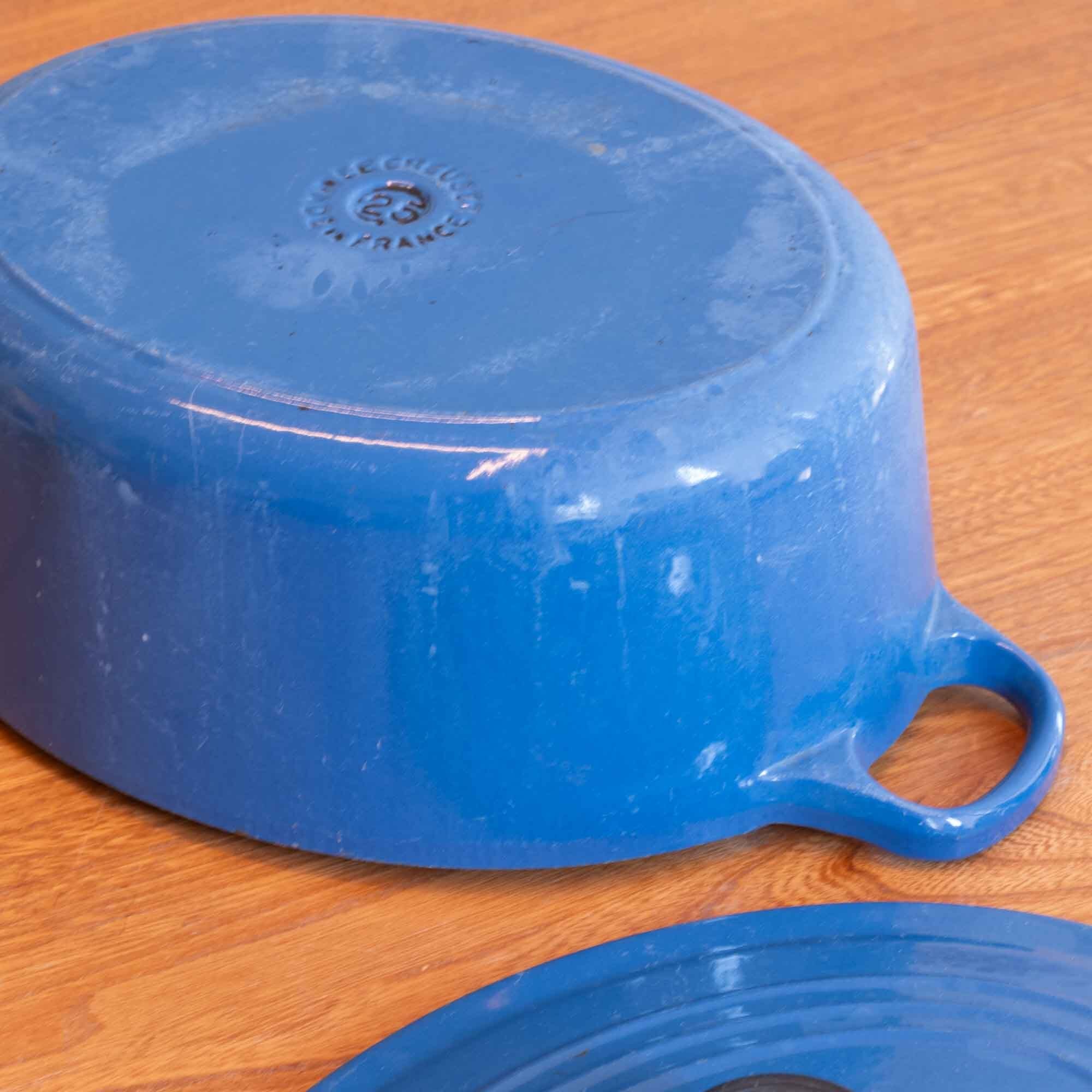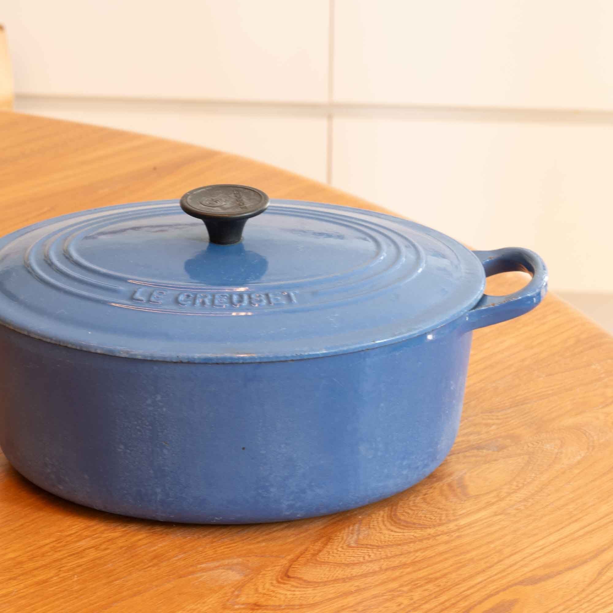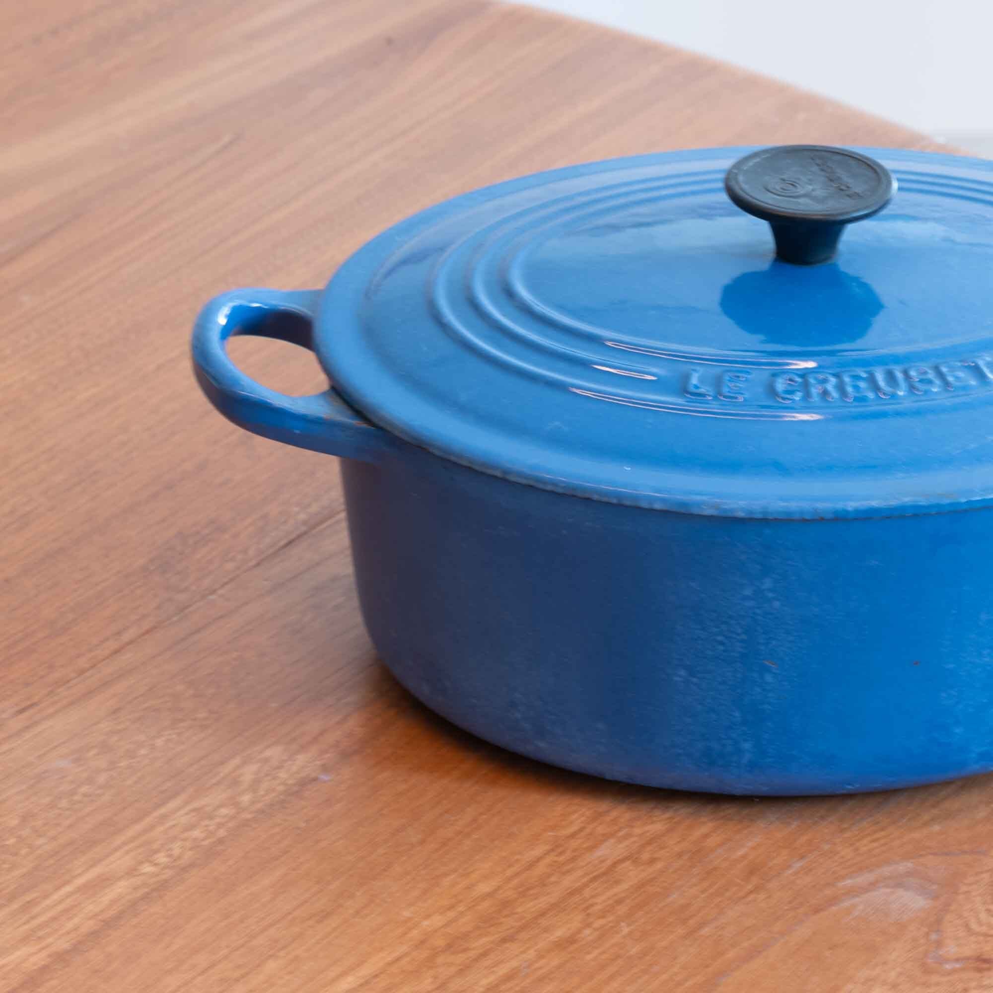 ビンテージ ル・クルーゼ LE CREUSET サイズ25のブルーカラーのオーバル形のホーロー鍋です。