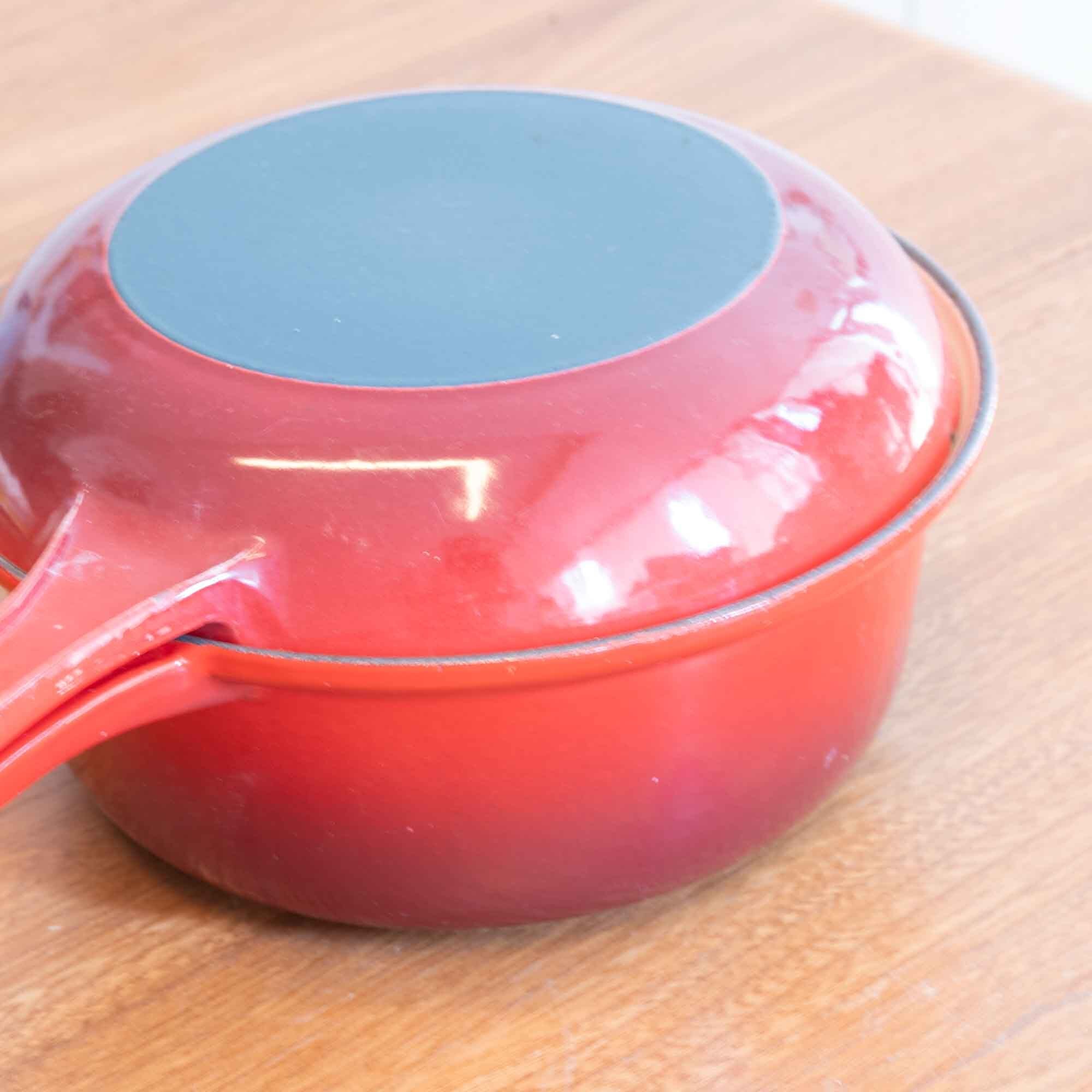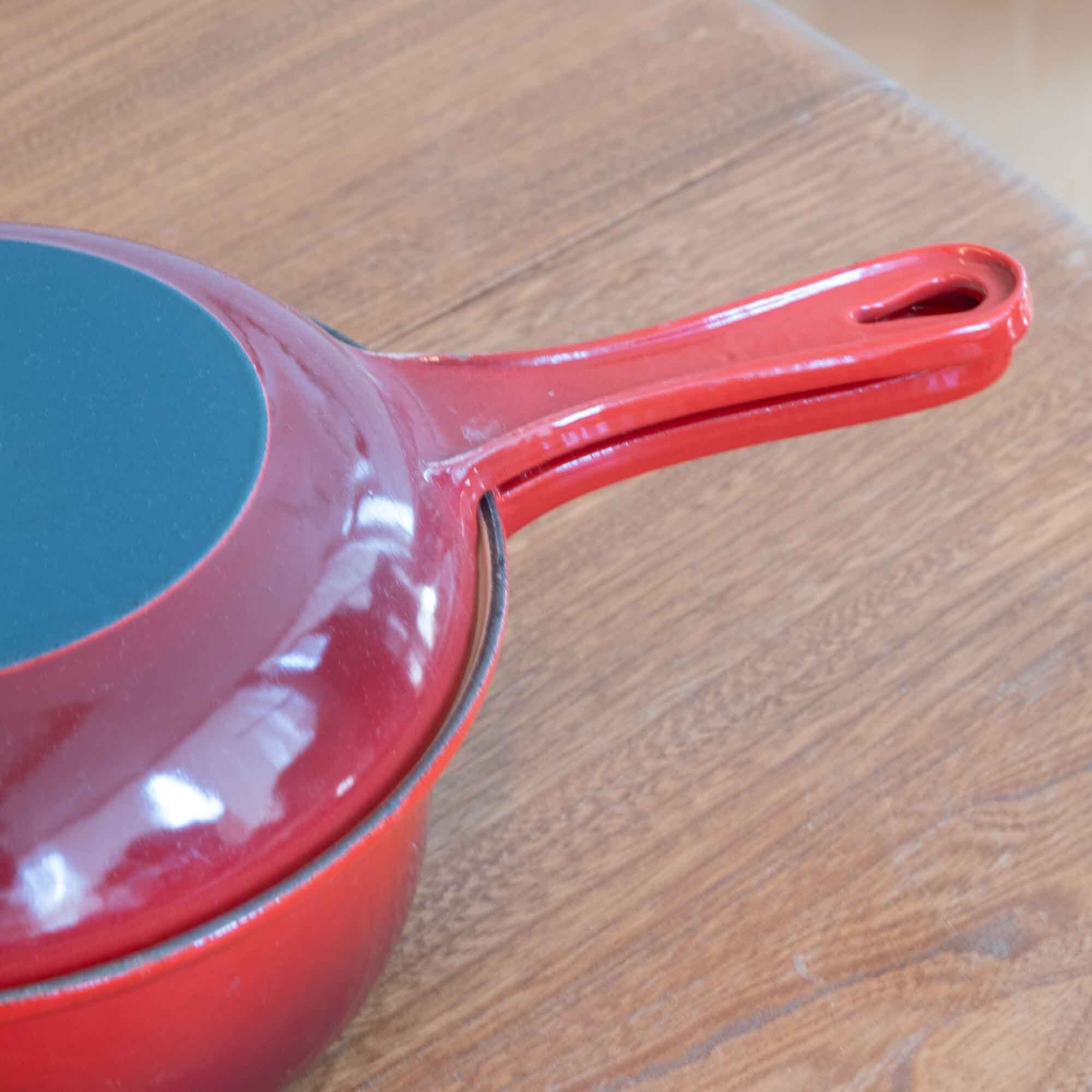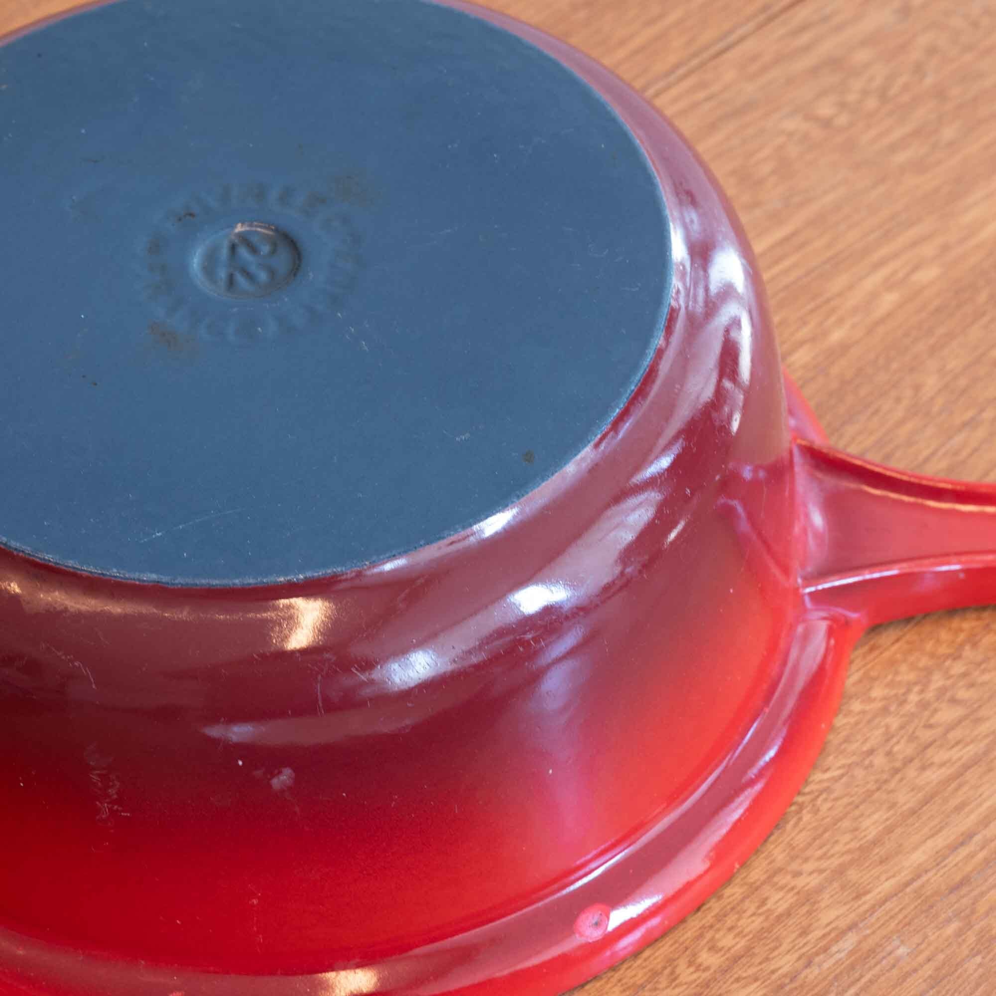 ビンテージ ル・クルーゼ LE CREUSET サイズ22の比較的大きなマルチファンクションタイプです。 マルチファンクションタイプは、蓋もフライパンとして使えます。 カラーは人気のチェリーレッドです。 使用された形跡はありませんが、新品・未使用品ではありませんが、 艶もあり美しい状態です。