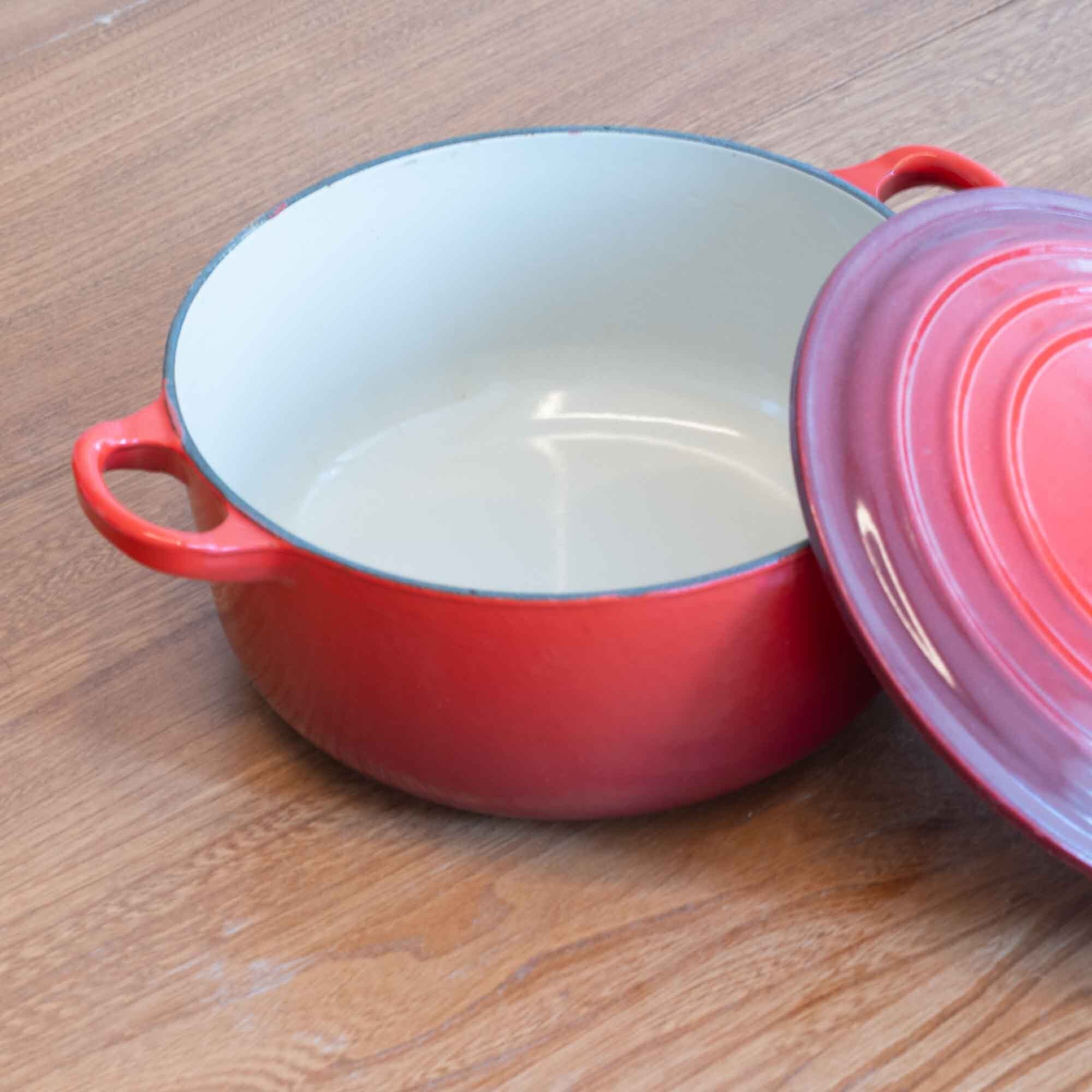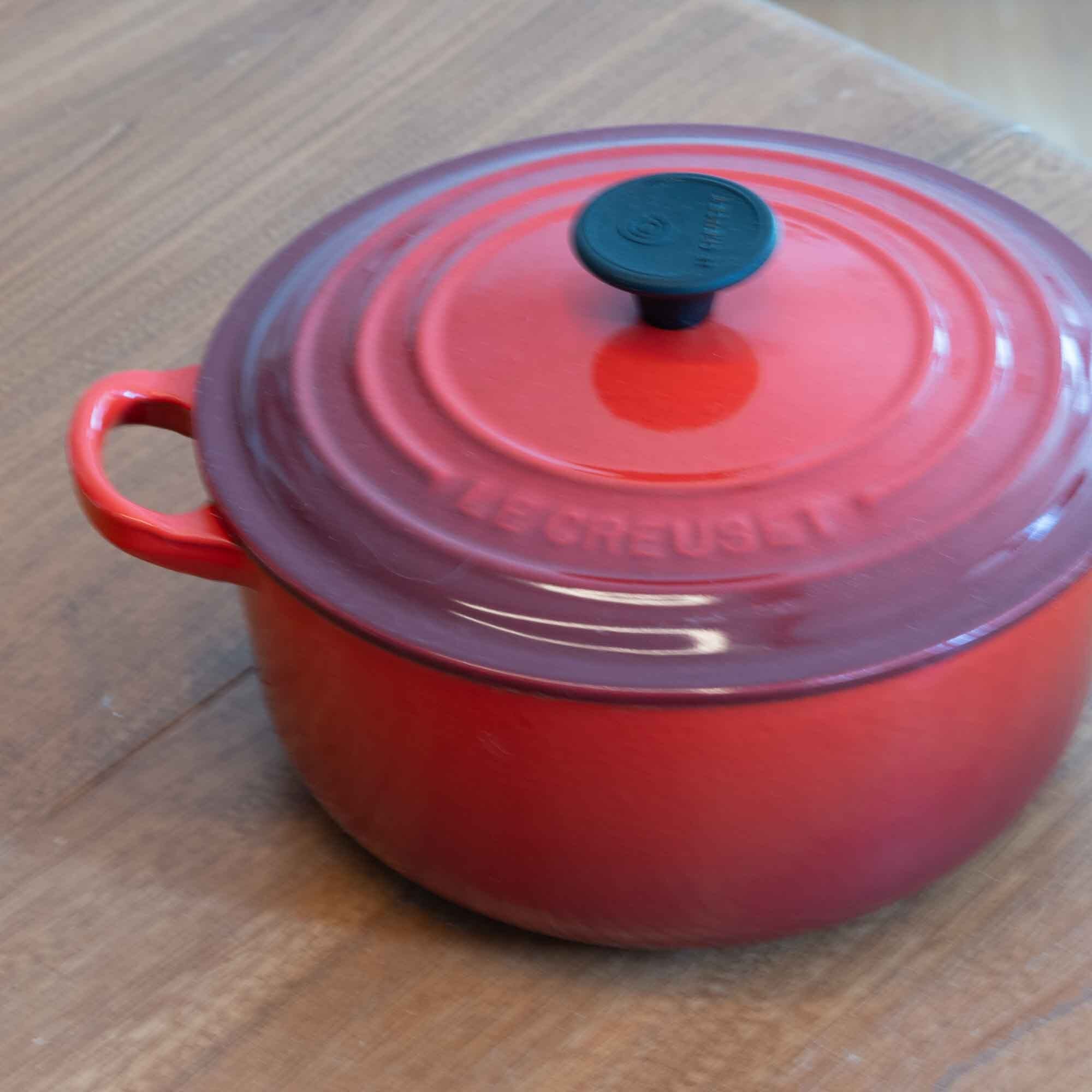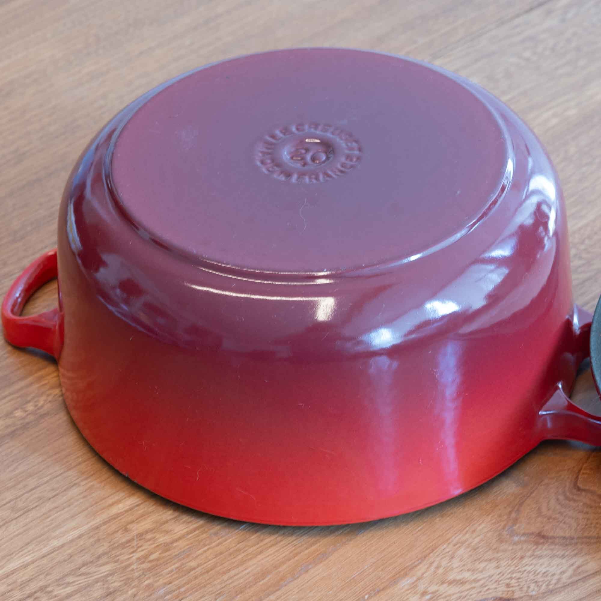 ビンテージ ル・クルーゼ LE CREUSET ですが、チェリーレッドはまだまだ現行品ですね! 使用感はありません。 未使用品と思いますが、箱などはありません。 ル・クルーゼ LE CREUSETは、価格が上昇していますので、こちらで試されるのもいいかと思います。 経年変化はありますが、美しいお鍋です。