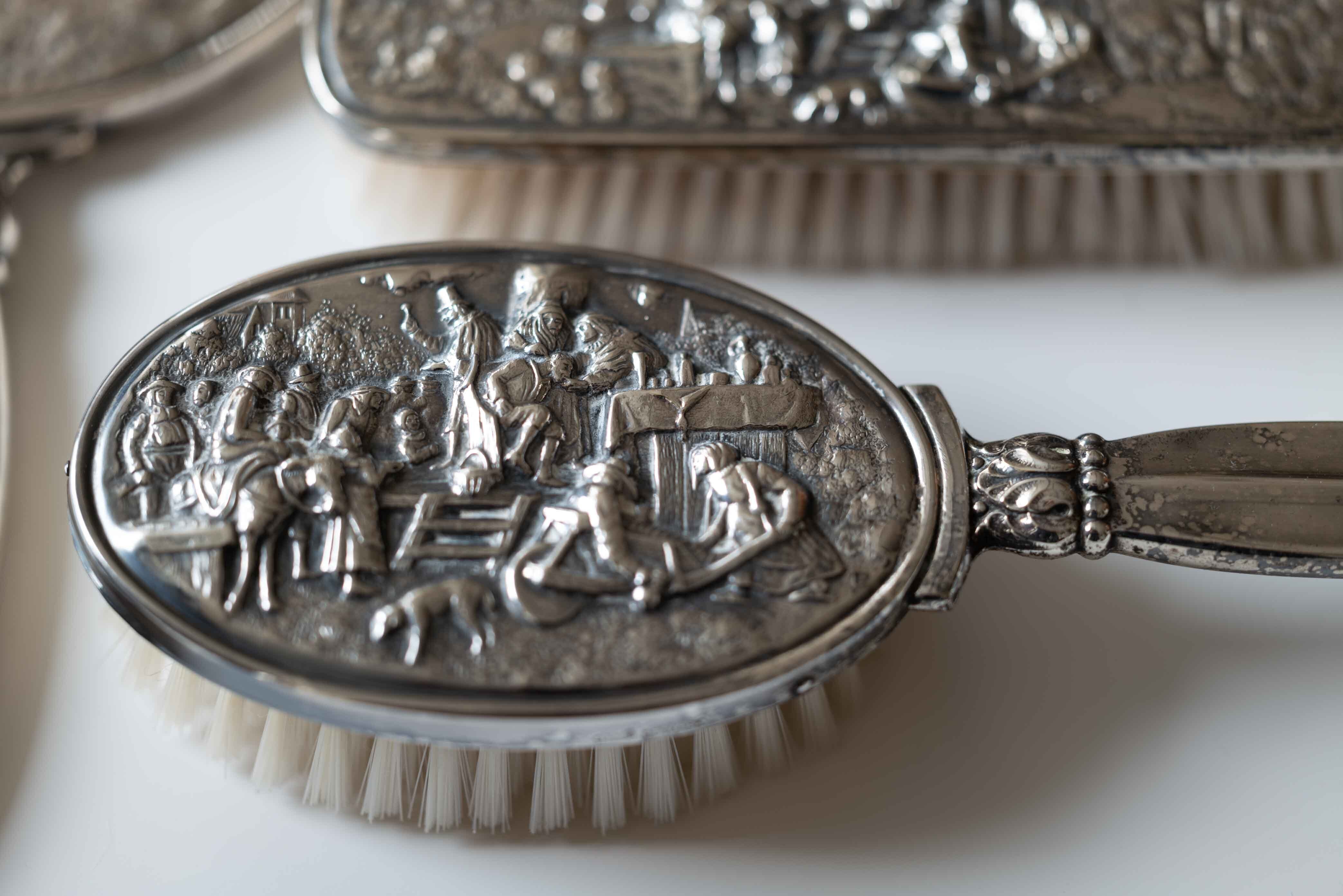 デンマーク製は銀製品で有名ですが、こちらもとても手の込んだ銀製の手鏡、服用ブラシ、靴用ブラシのエチケット3点セットです。