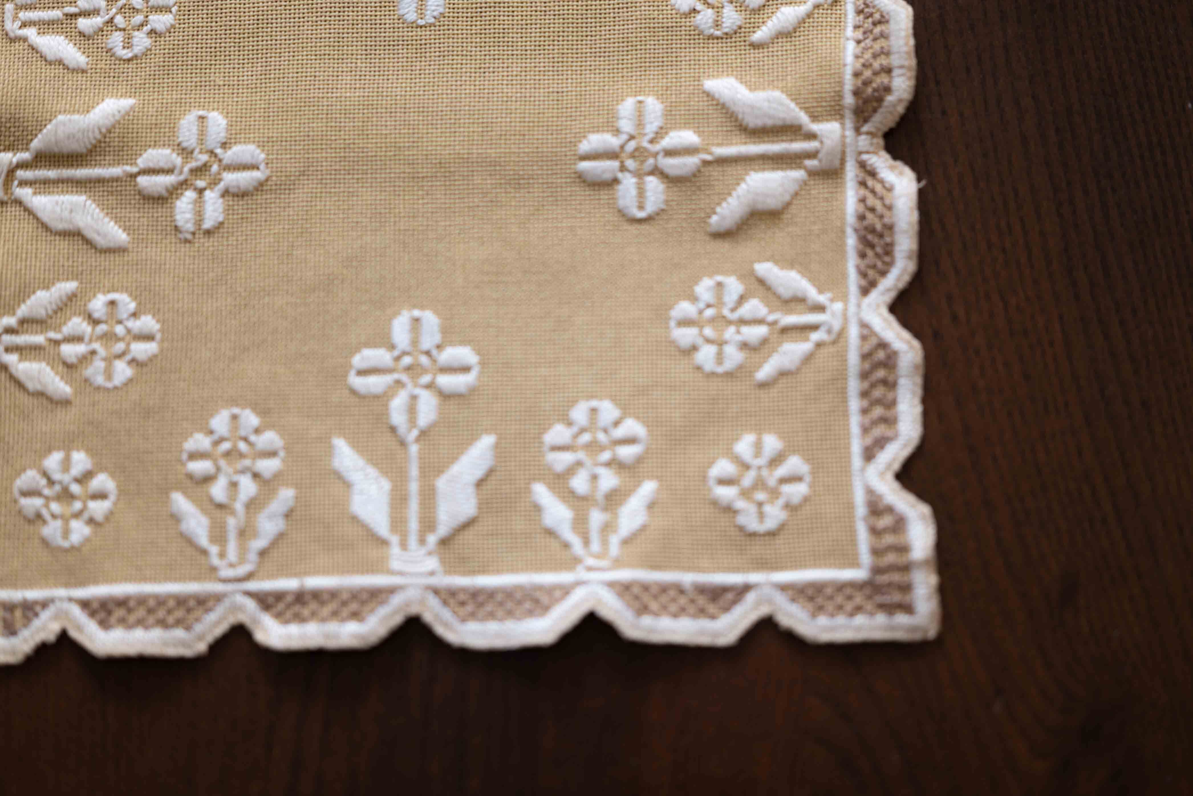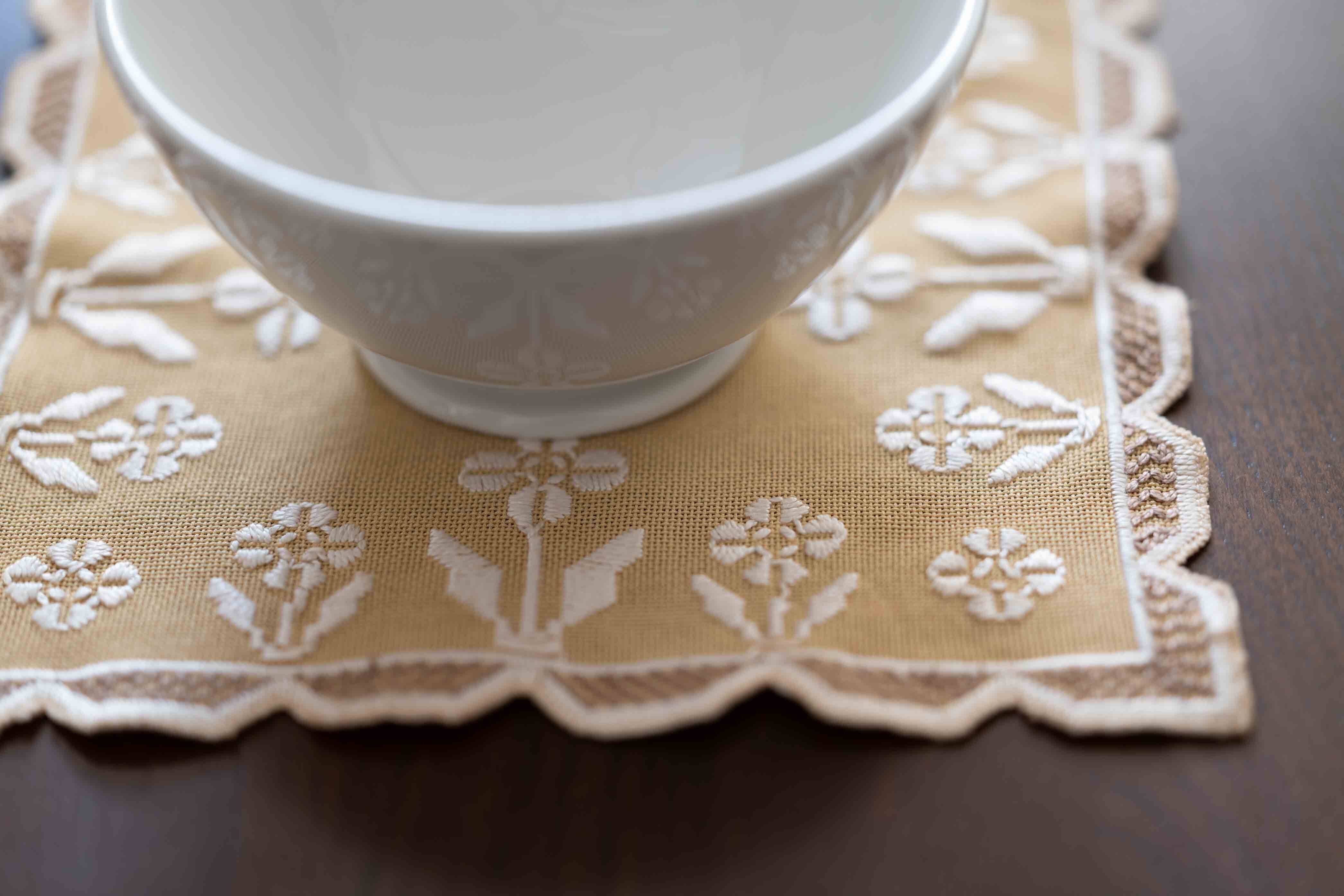 ミニサイズのテーブルクロス カフェオレボウルと相性抜群です! 手刺繍 麻製品 北欧仕入れです