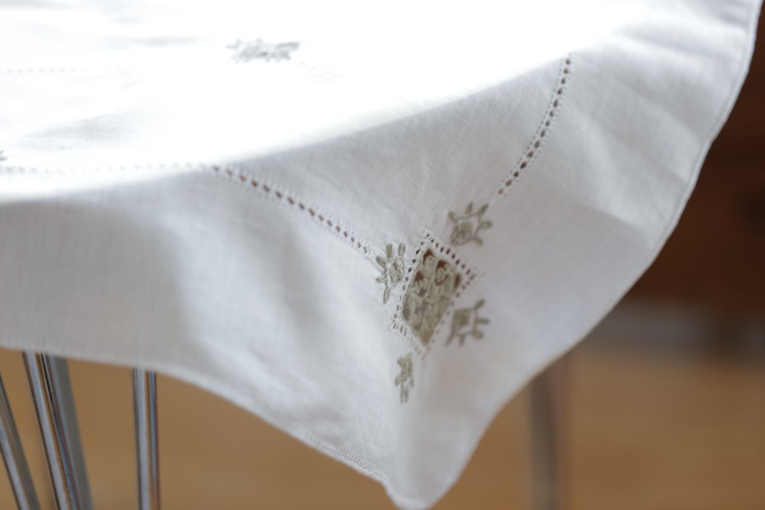 透け感のある上質の麻生地にグレーの糸で刺繍がしてあります。北欧仕入れのテーブルクロス
