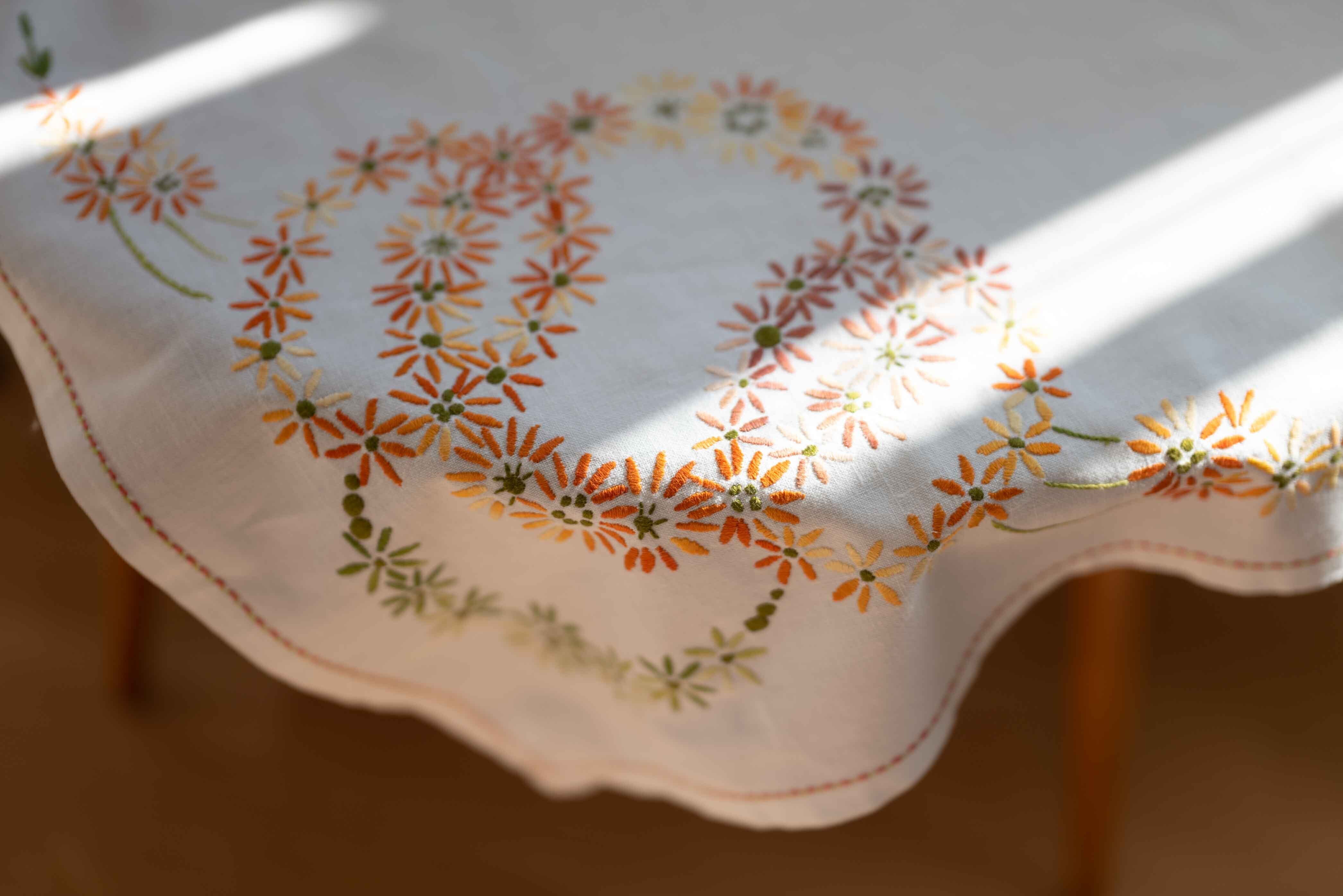 の小さなテーブルクロスの中に、さまざまな色糸を使って刺繍されています。