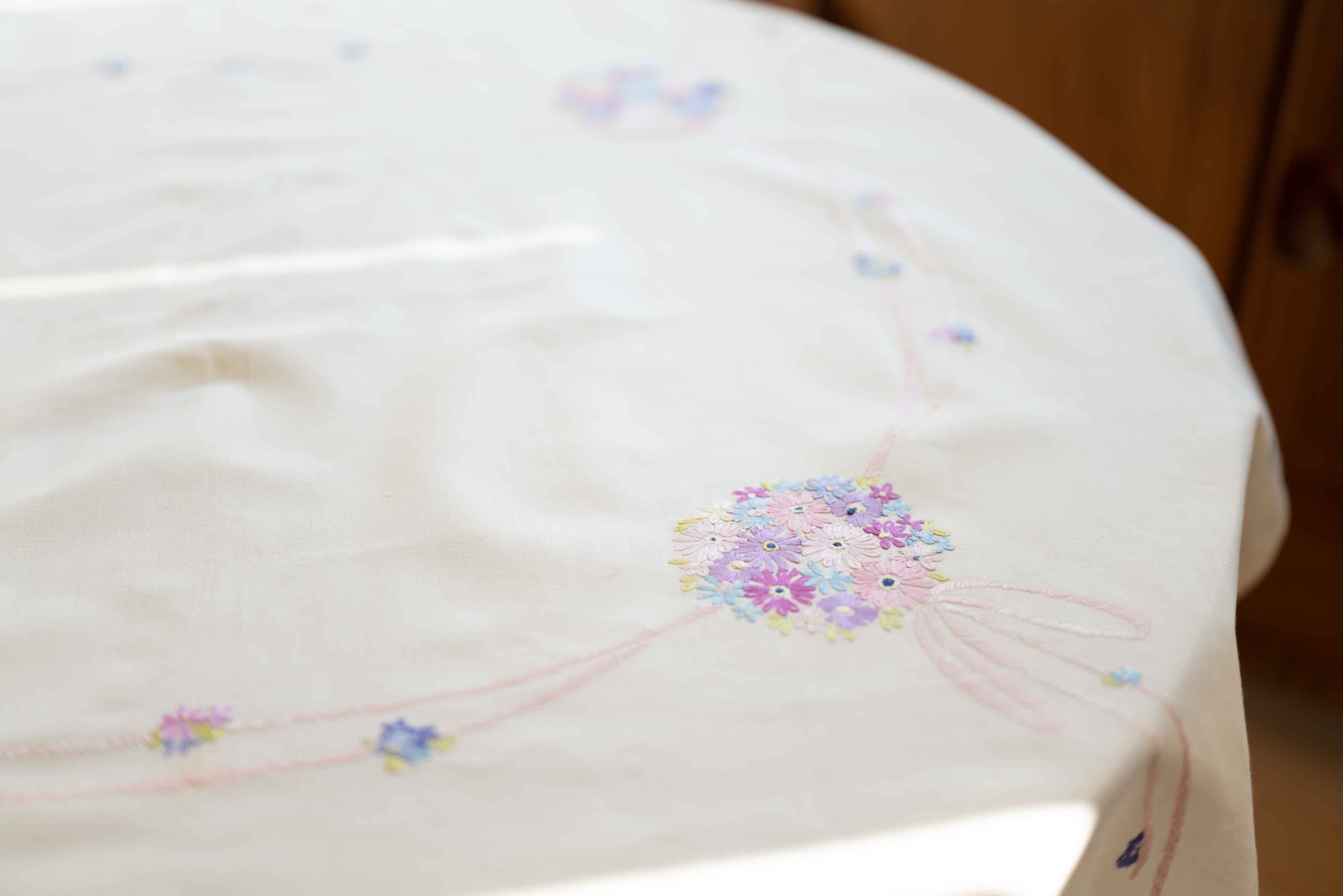 おそらく麻の生地にシンプルなクロスステッチでお花が可憐に表現されています。