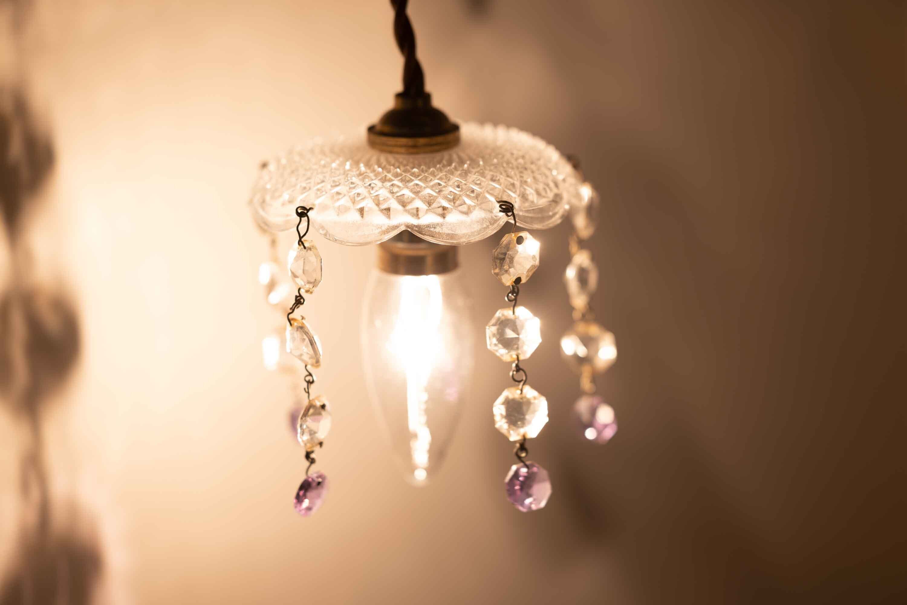 写真では分かりにくいですが、垂れ下がったガラスパーツの一番地面に近いパーツが1つだけ薄紫色に着色してあり、すみれ色に光ります。