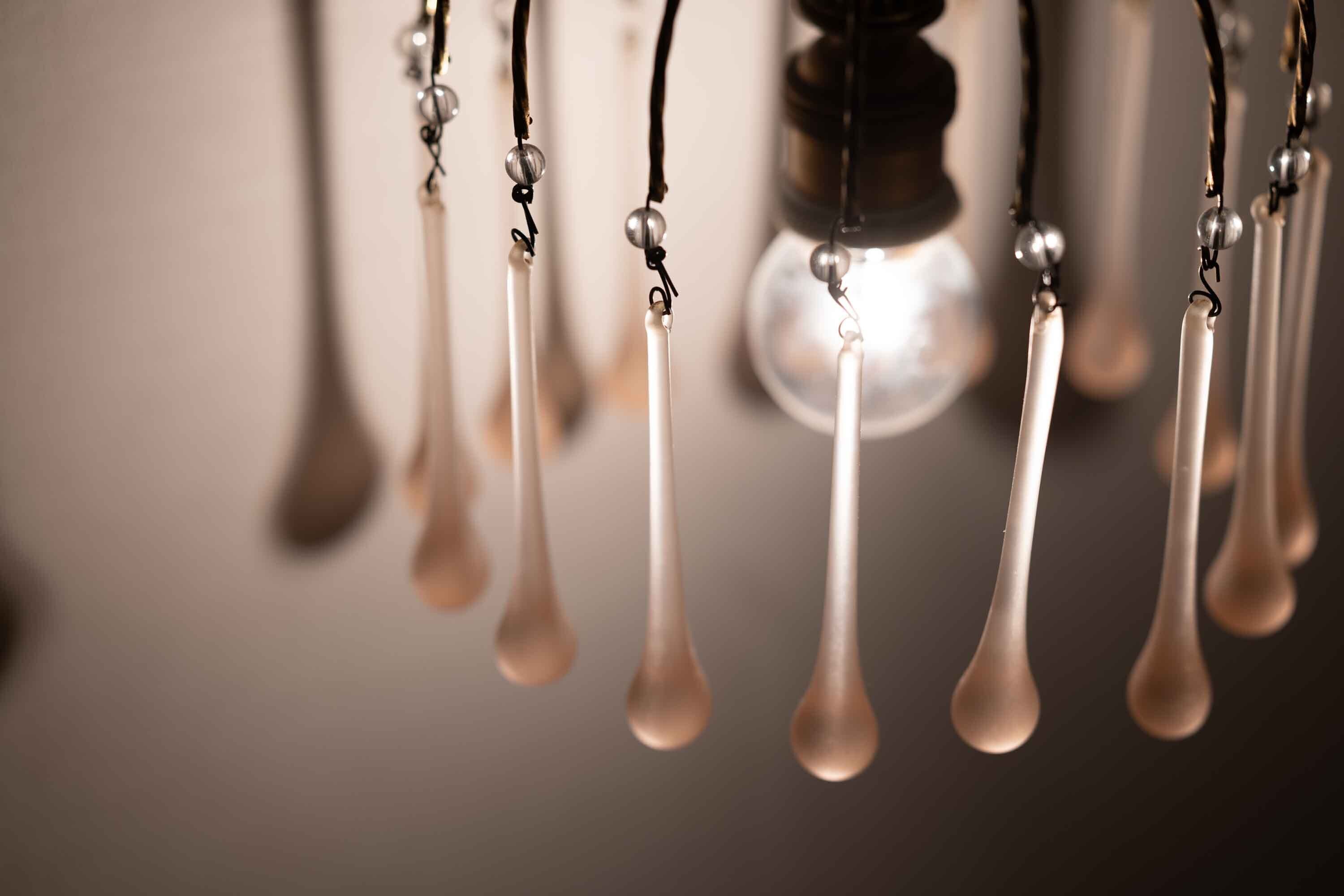 ピンクのドロップ型のガラス飾りが愛らしいミニシャンデリア 一般照明用電球が使えます。