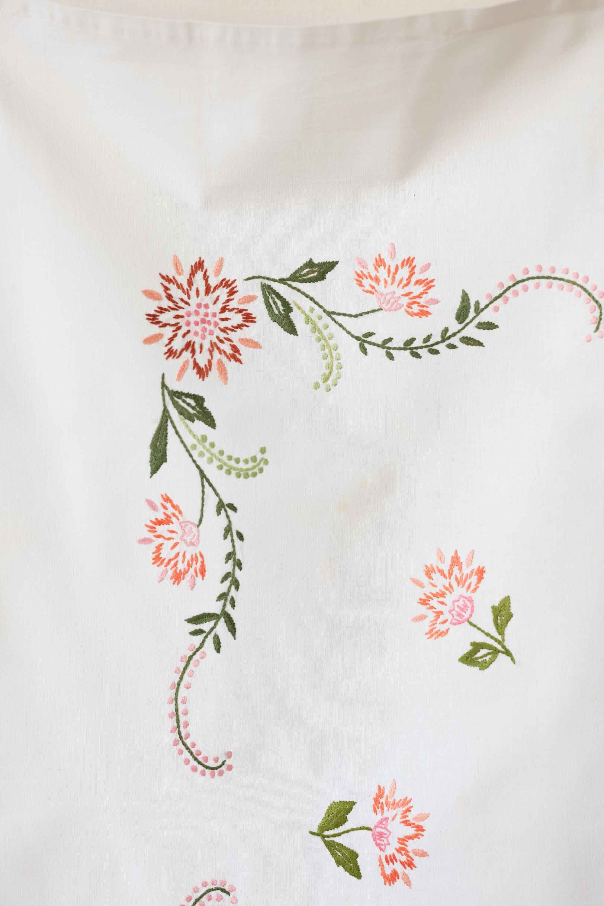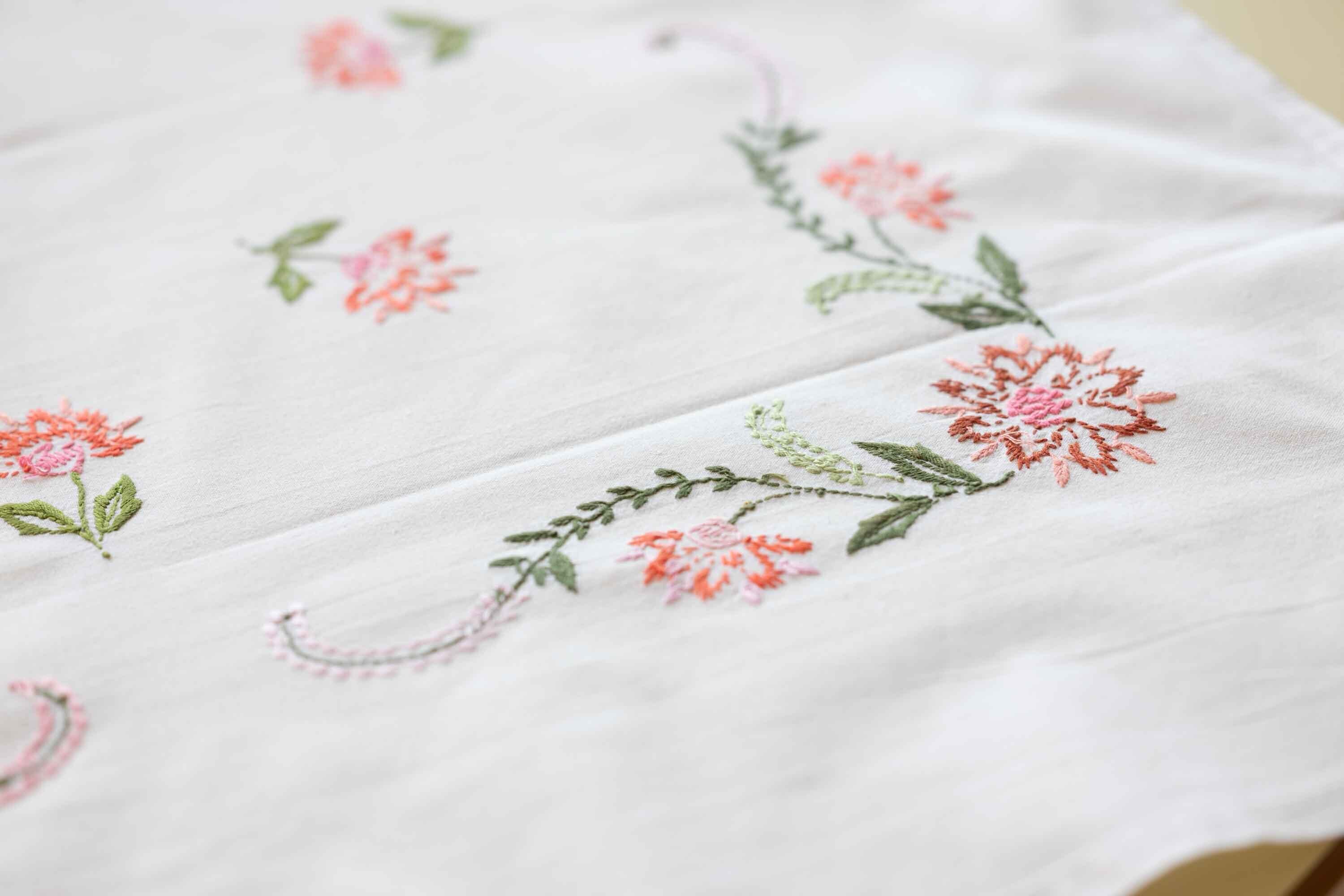 花と緑の細かすぎないステッチが独特です。とても統一感のある手刺繍。北欧仕入れ