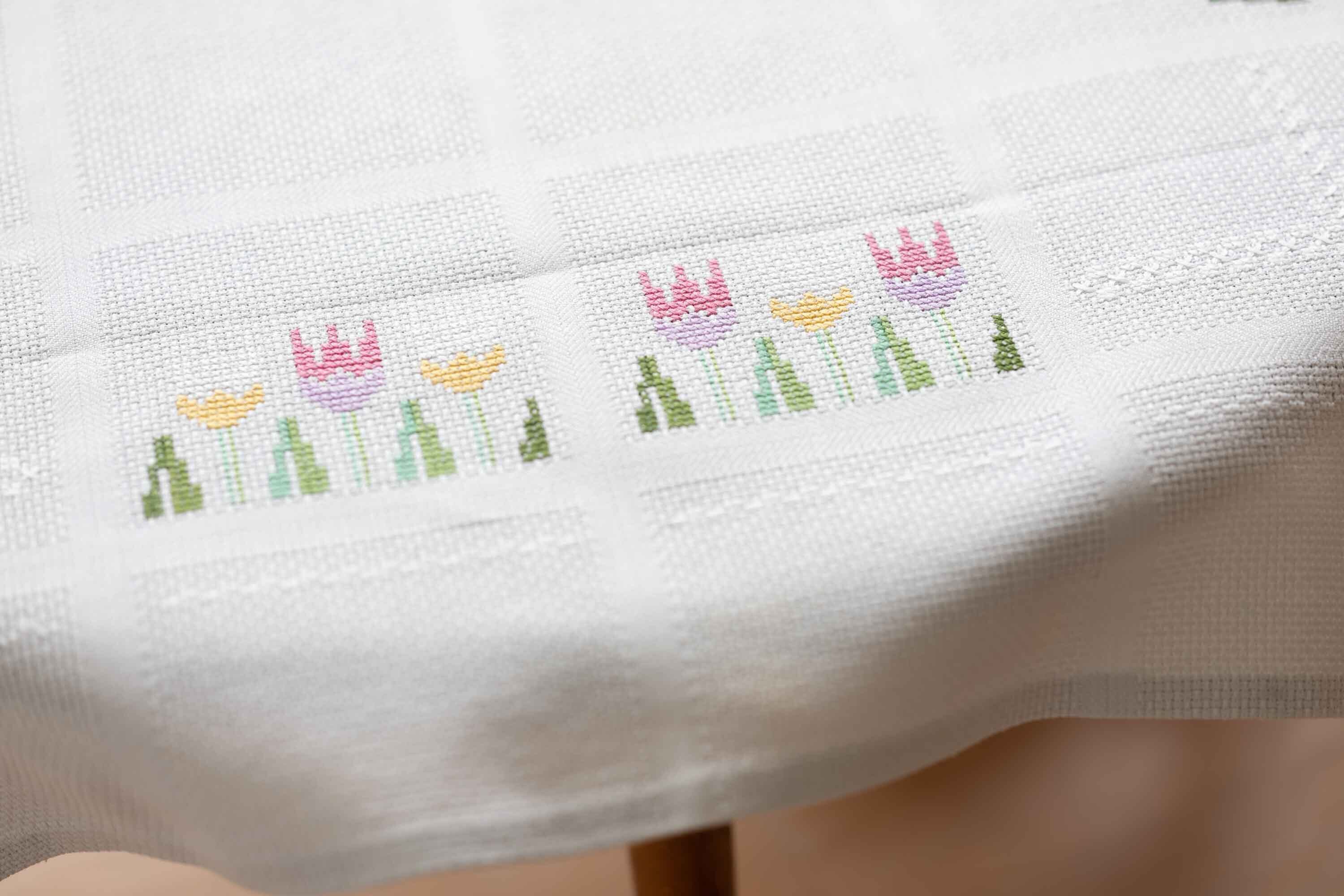 チューリップがクロスステッチで描かれた明るく元気をくれるテーブルクロスです。北欧仕入れ