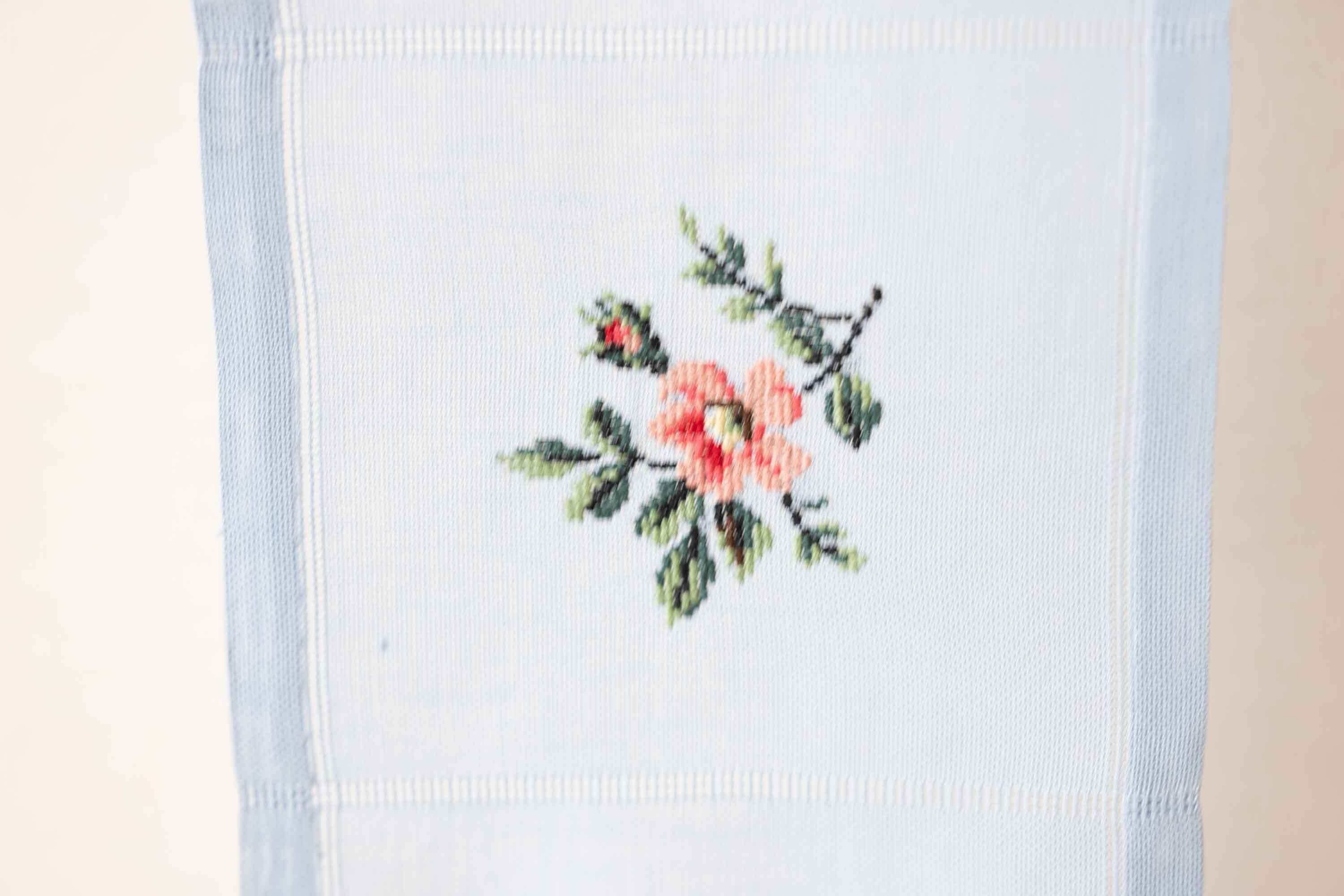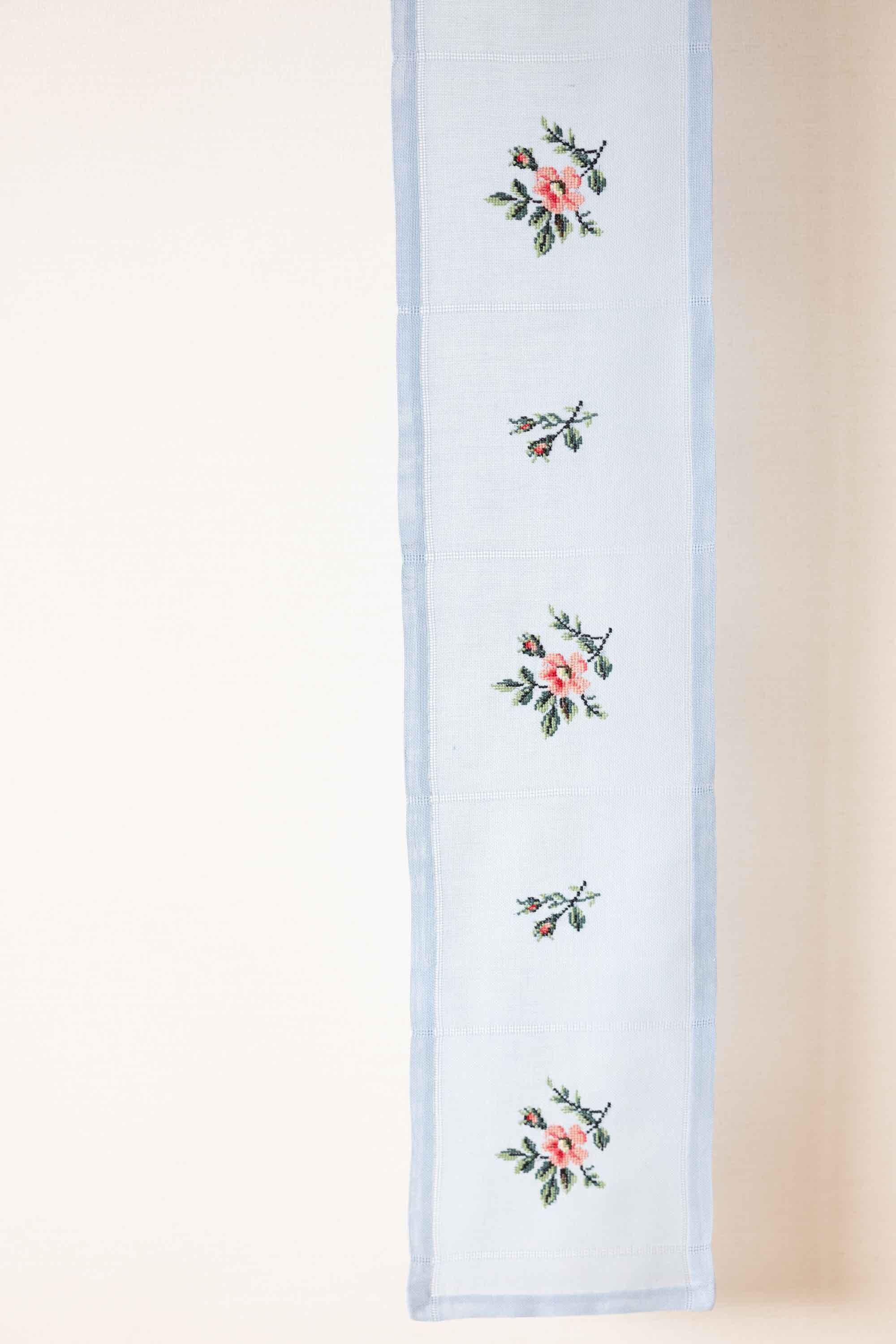 おそらく麻の生地(ブルー)に愛らしく小花が手刺繍されています。北欧仕入れ テーブルランナーに