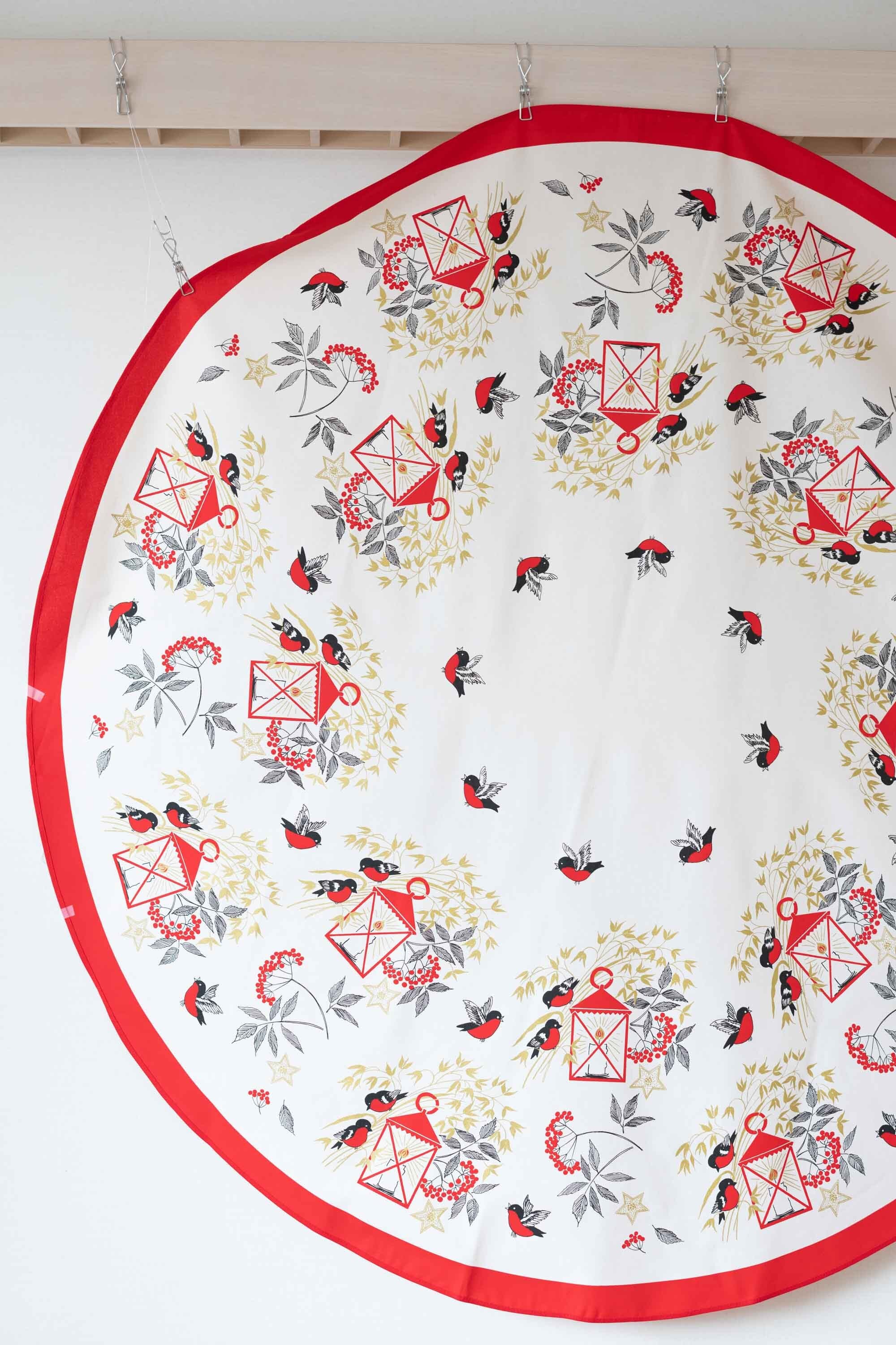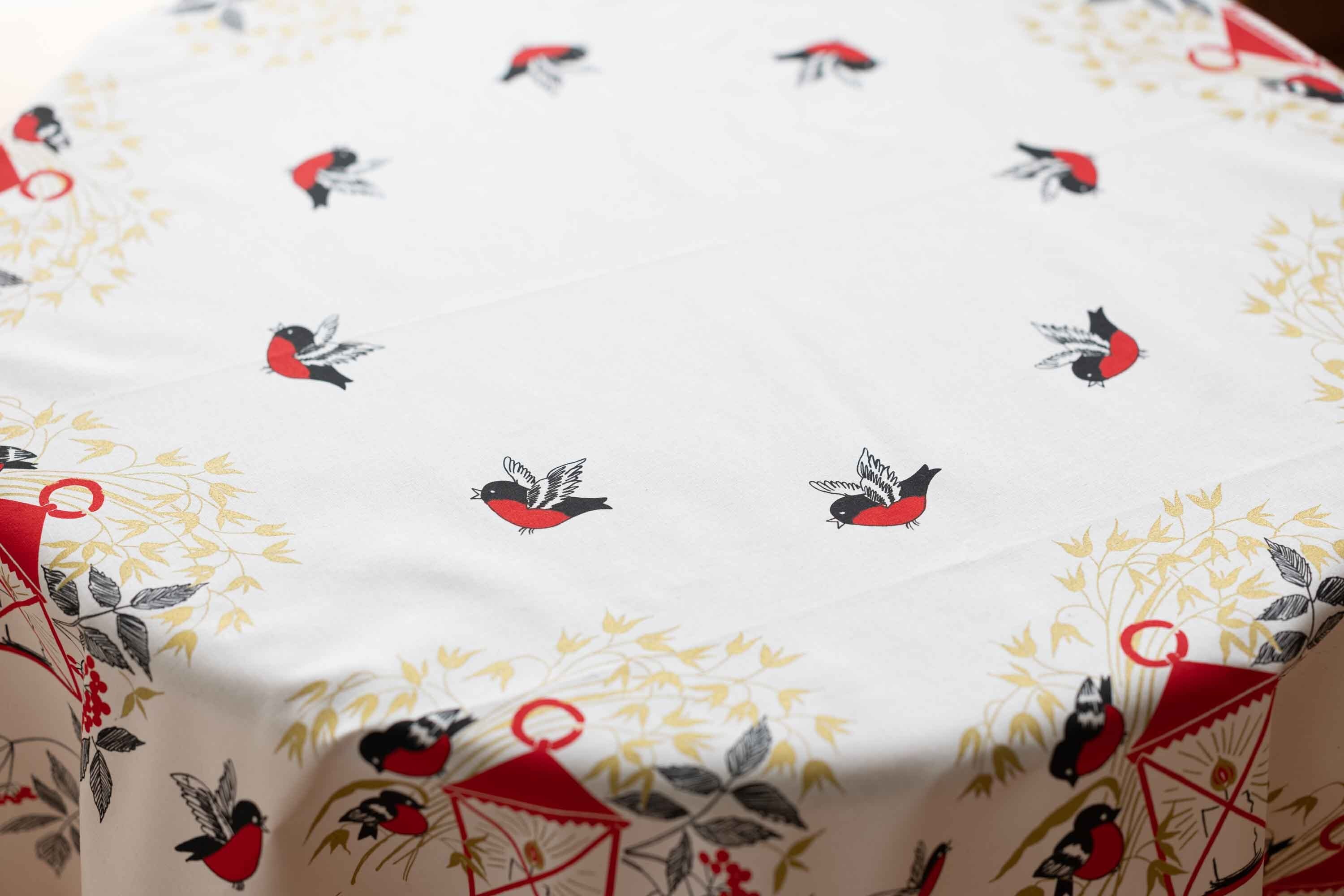 北欧雑貨で大人気のalmedahls(アルメダールス)のビンテージ円形テーブルクロス キャンドルと鳥のモチーフが素敵です!