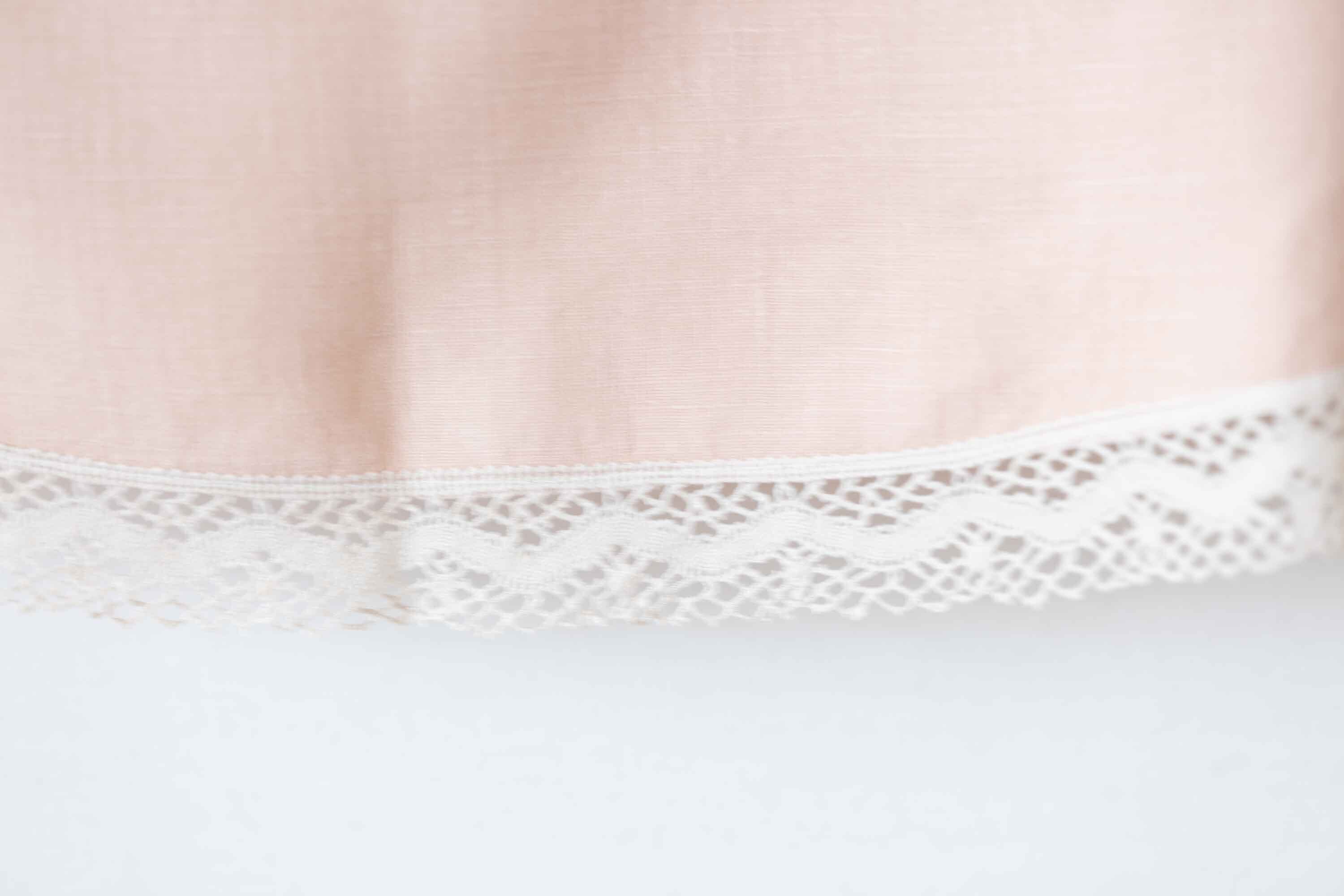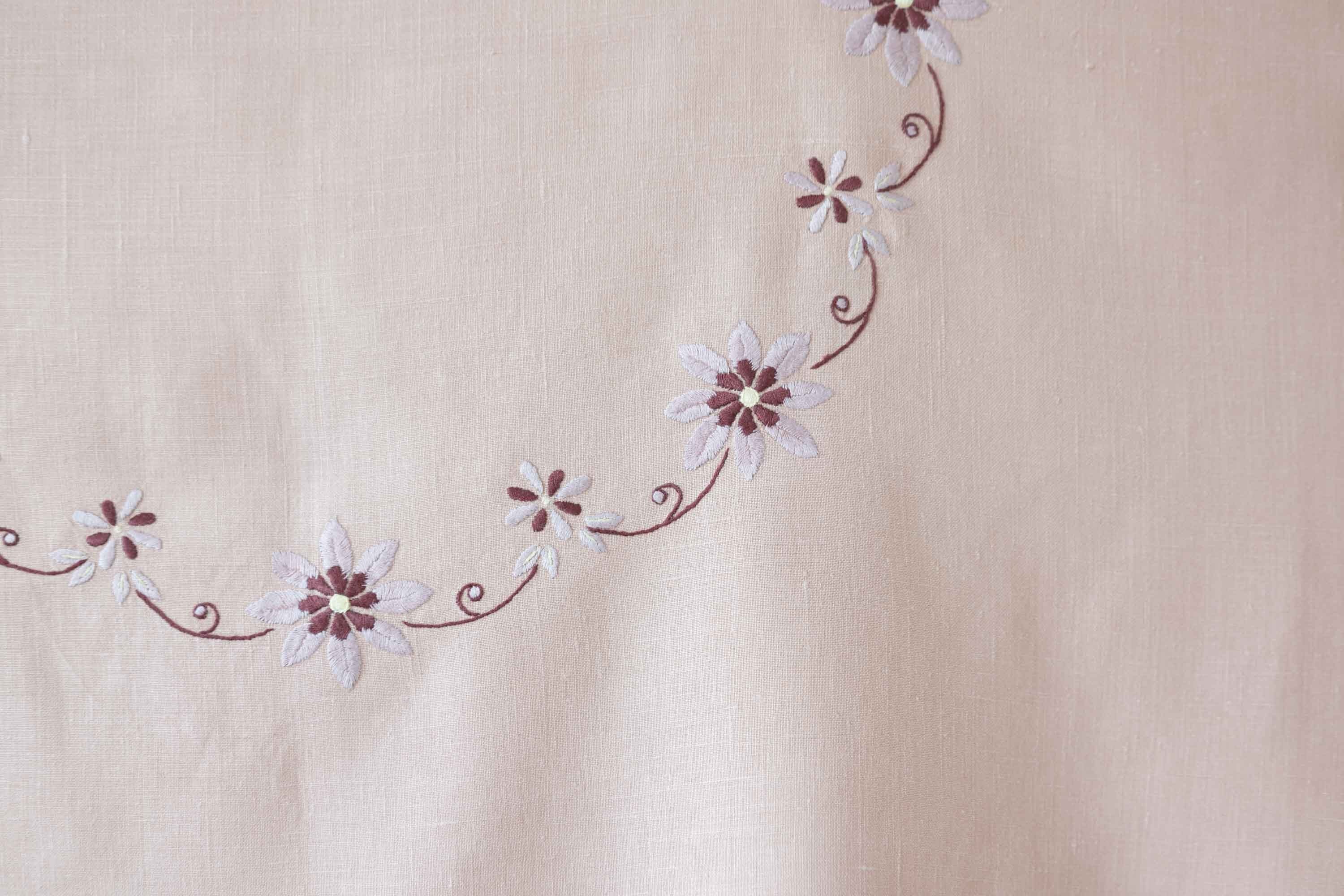 柔らかな麻かコットンの生地に、手刺繍風に機械刺繍が施されています。周りのレースも素敵です!