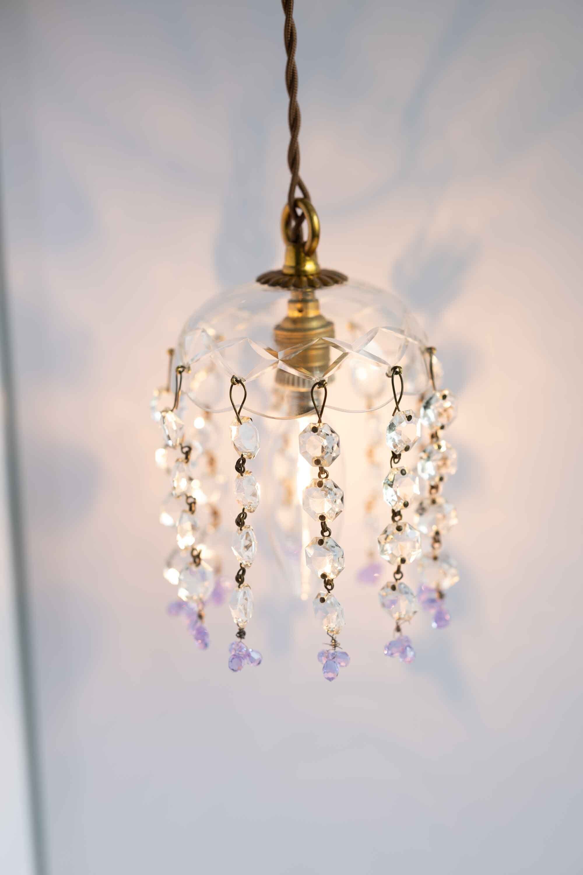 ミニシャンデリア ドロップ部の1つがすみれ色です。クリスタルガラスの質が大変素晴らしいです!ドロップガラスは10本です。