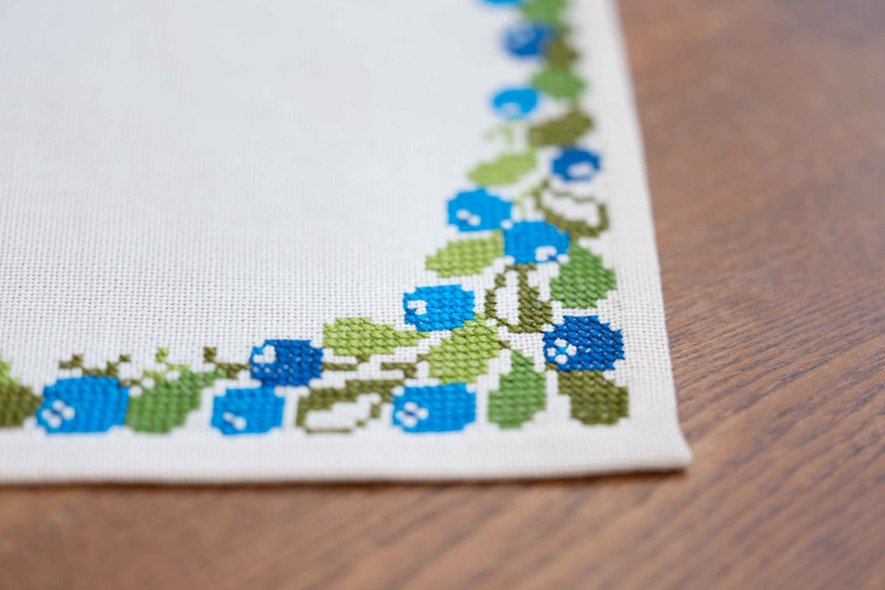 しっかりとした麻布にブルーのベリー柄が手刺繍されています。北欧仕入れ