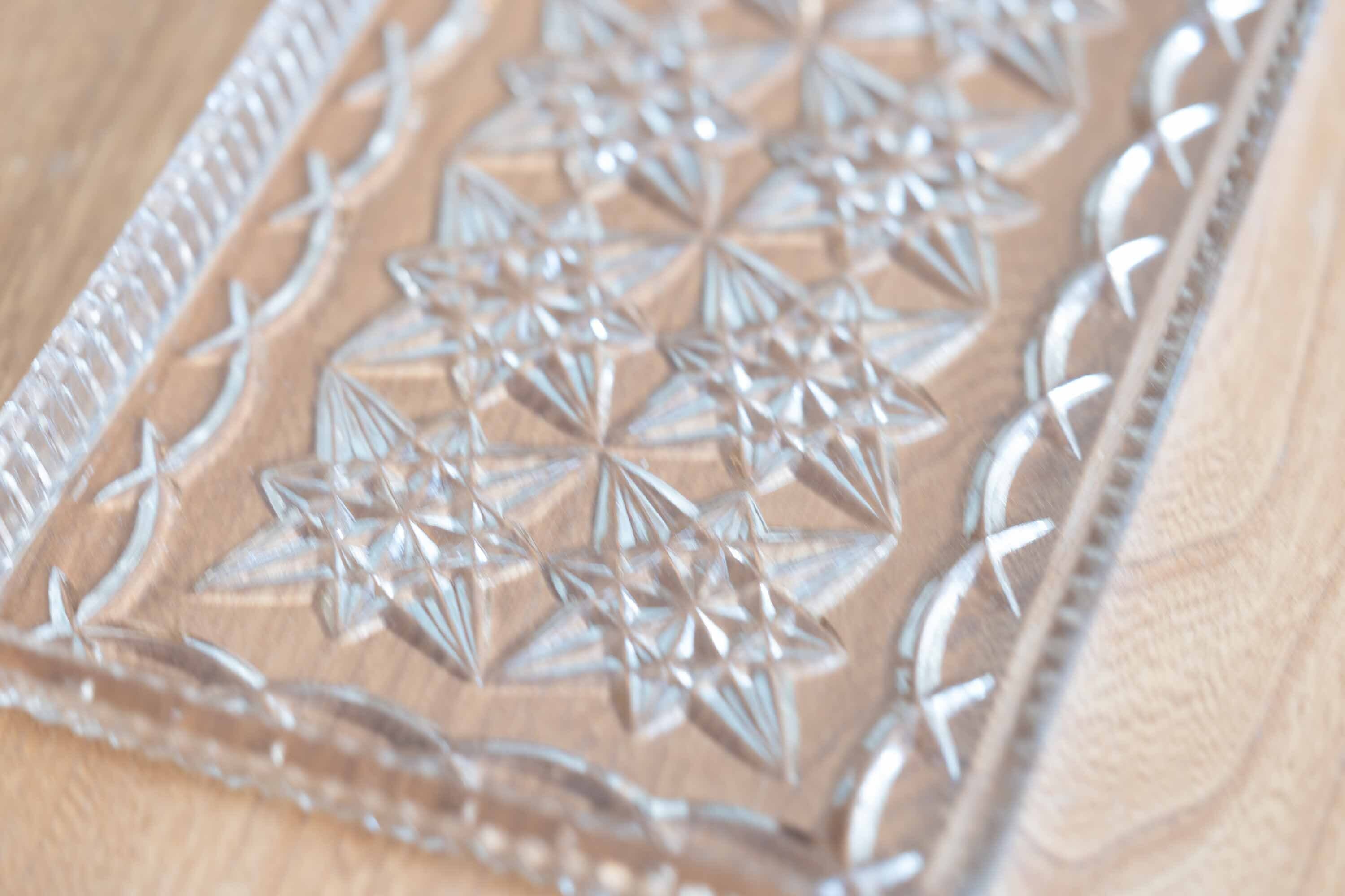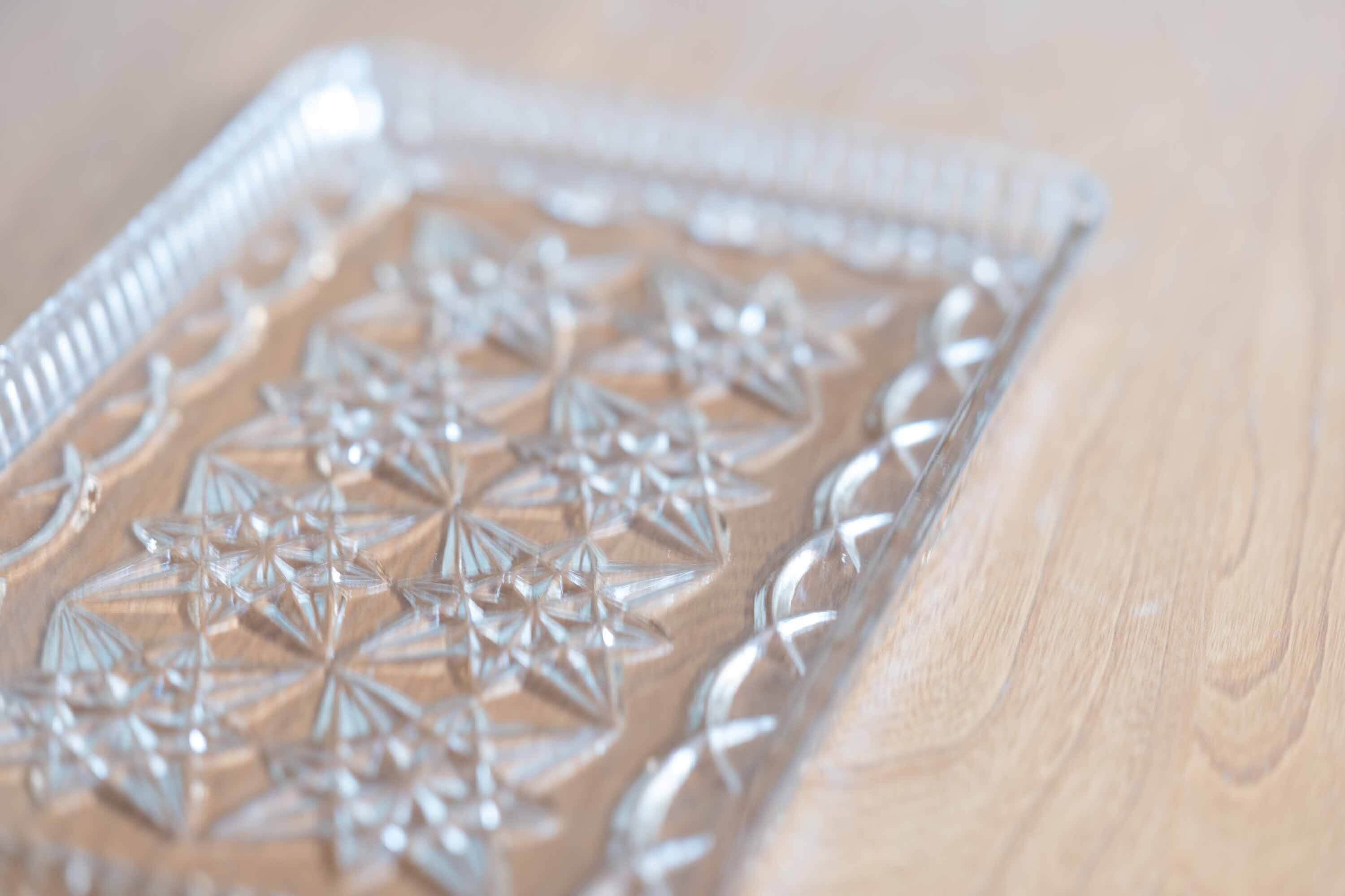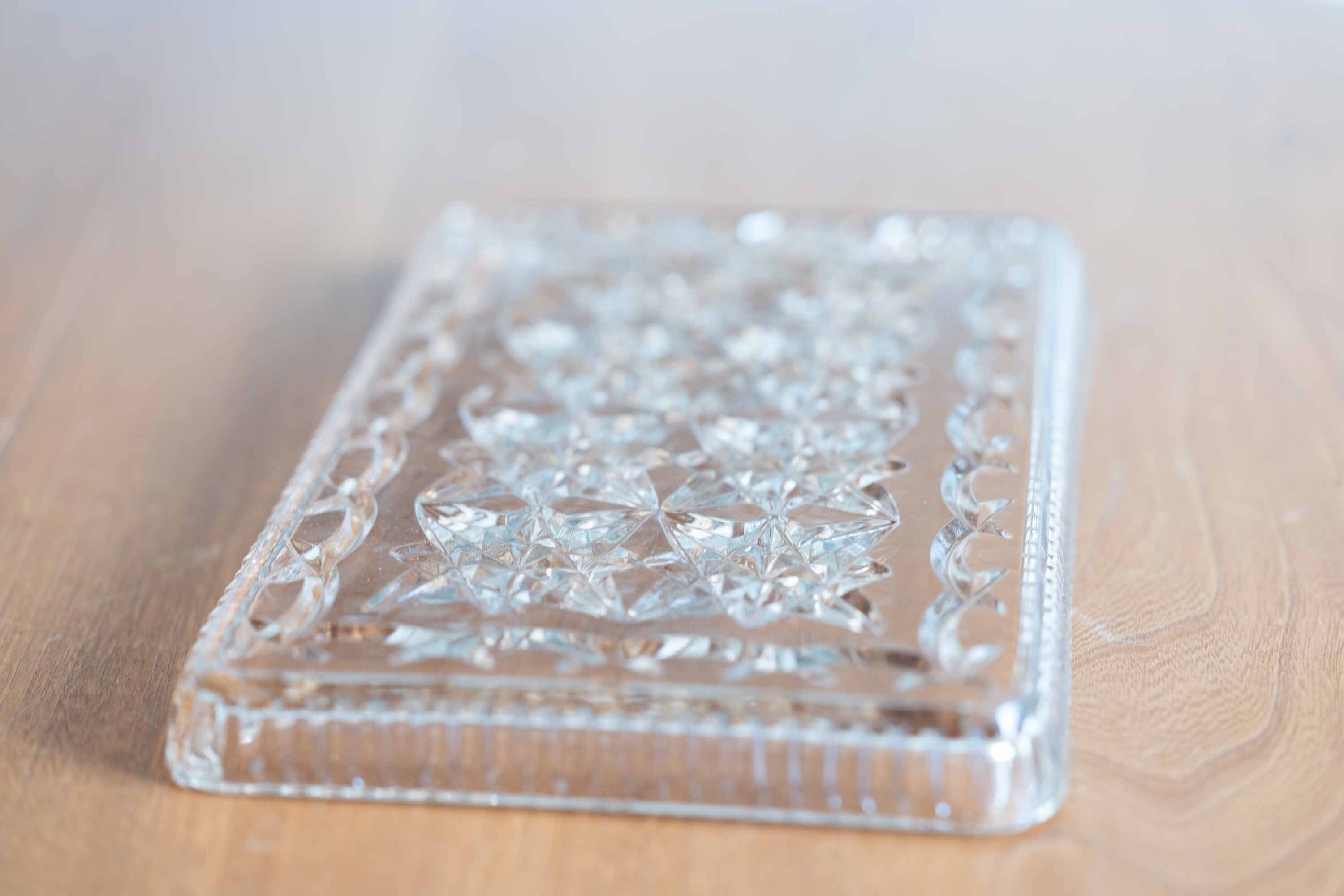 キャンドルホルダーやコットン入れなどがセットになって大変優雅で贅沢なものですが、こちらはガラスのプレートのみになったものです。