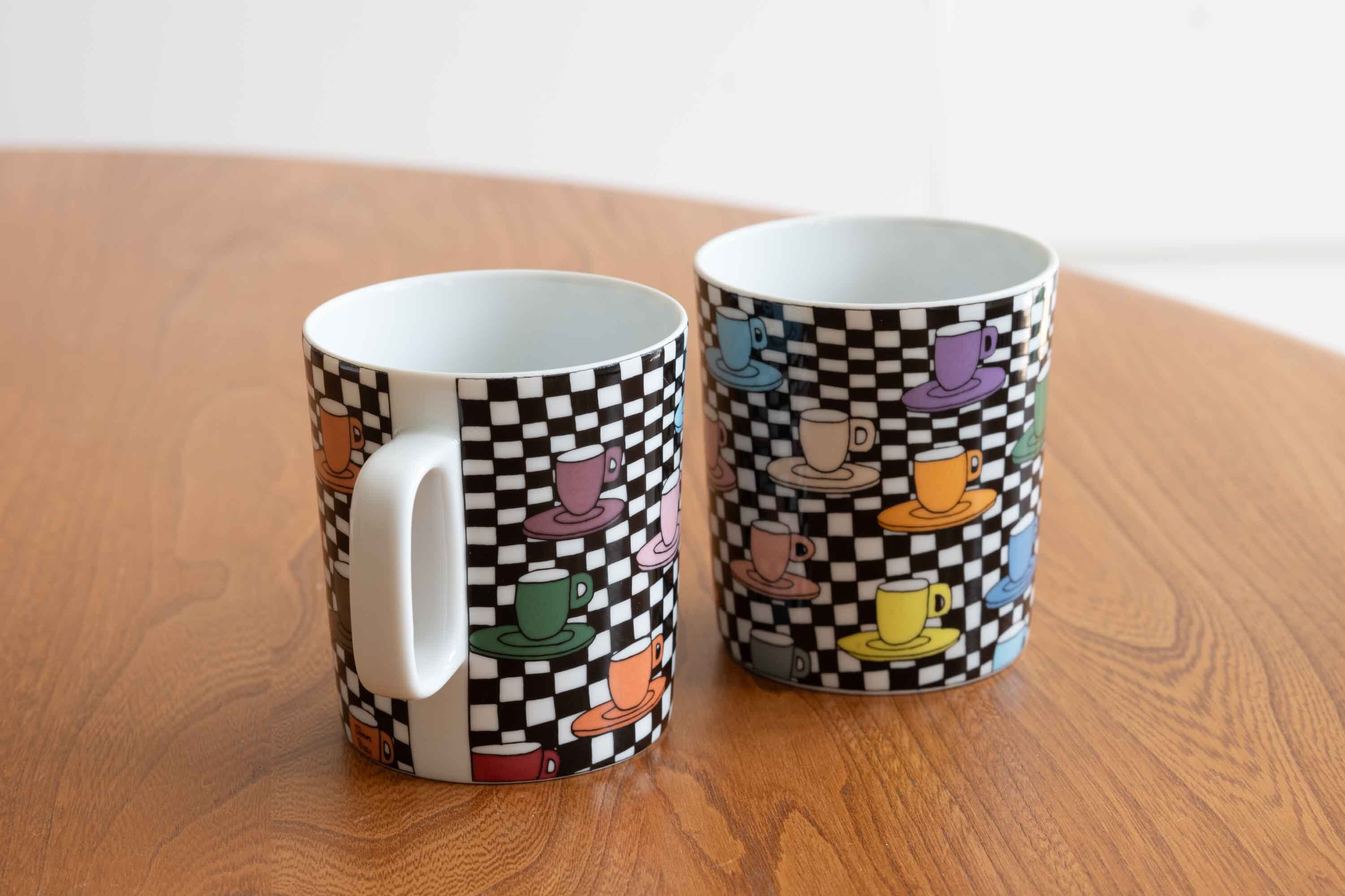 ブラックチェックの中に色とりどりのカップアンドサーサーが描かれています。