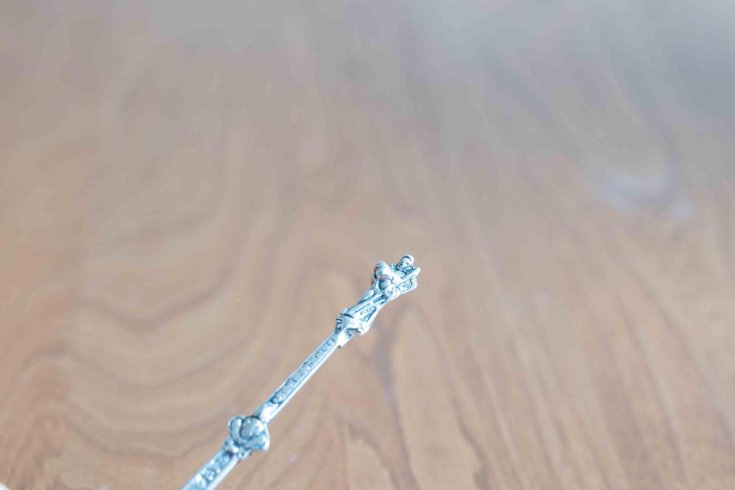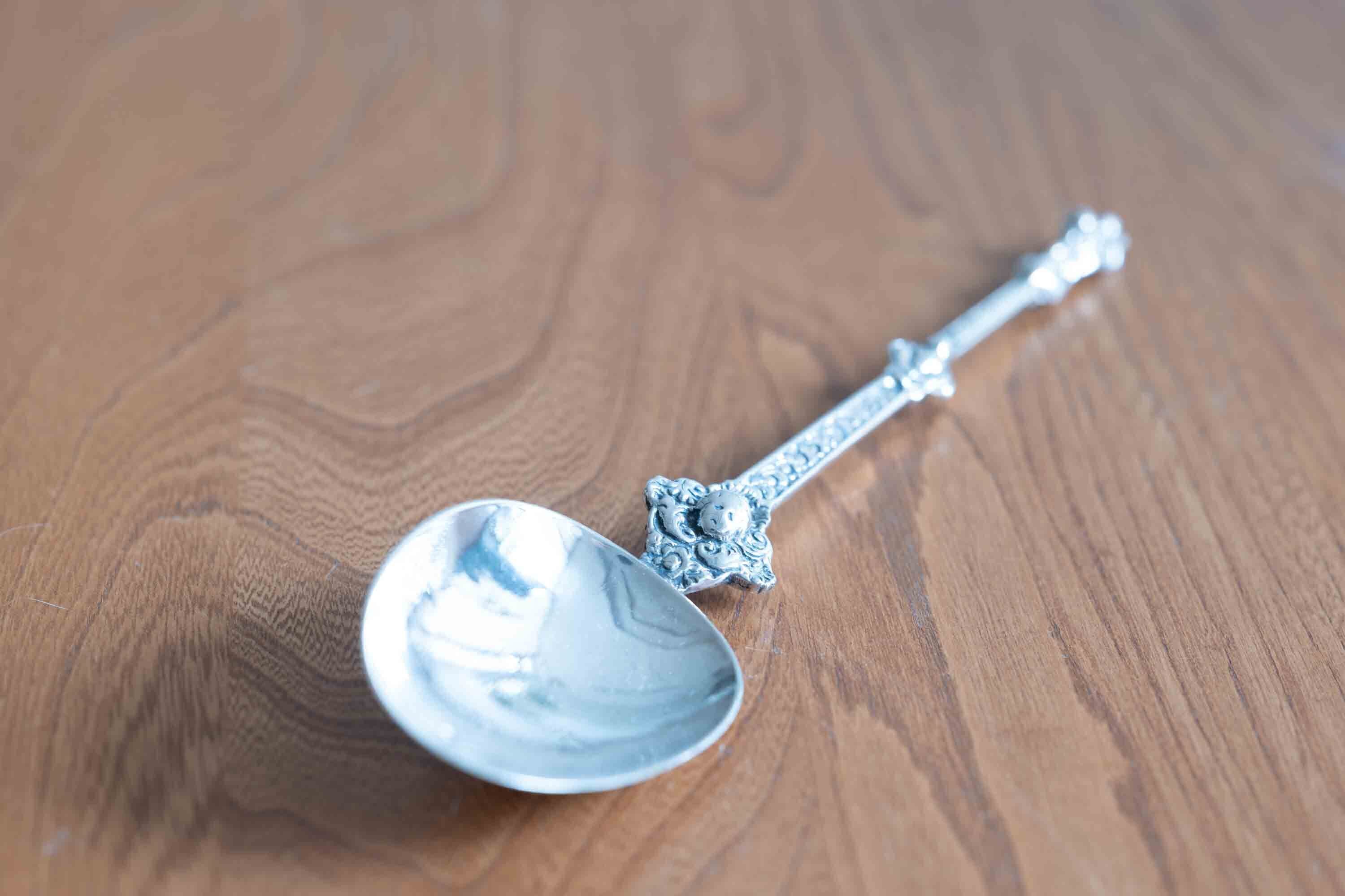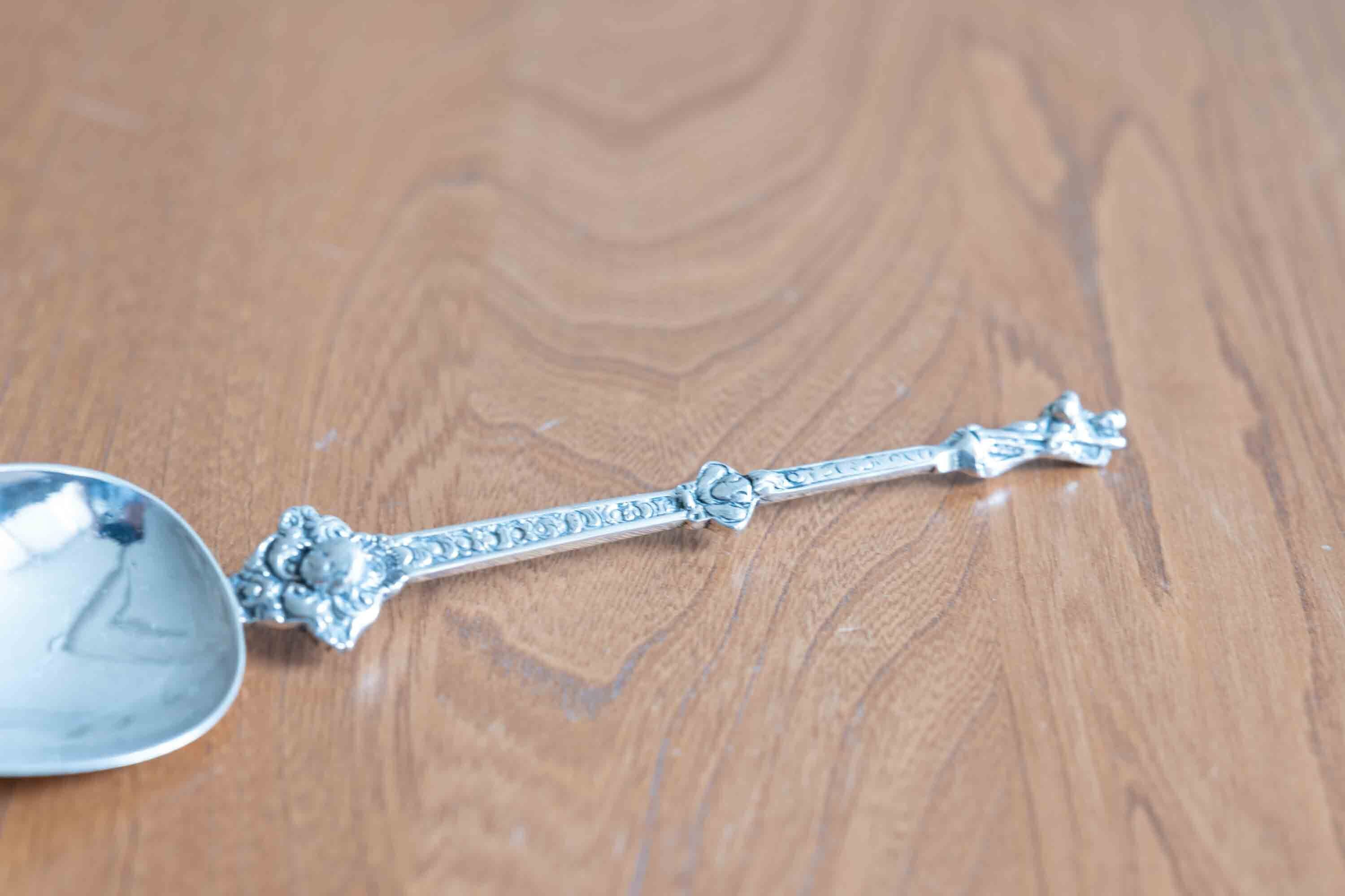 純銀製スプーン 1822年製造 エンジェルや羊を抱える聖人(イエスキリスト像?)が見えます。